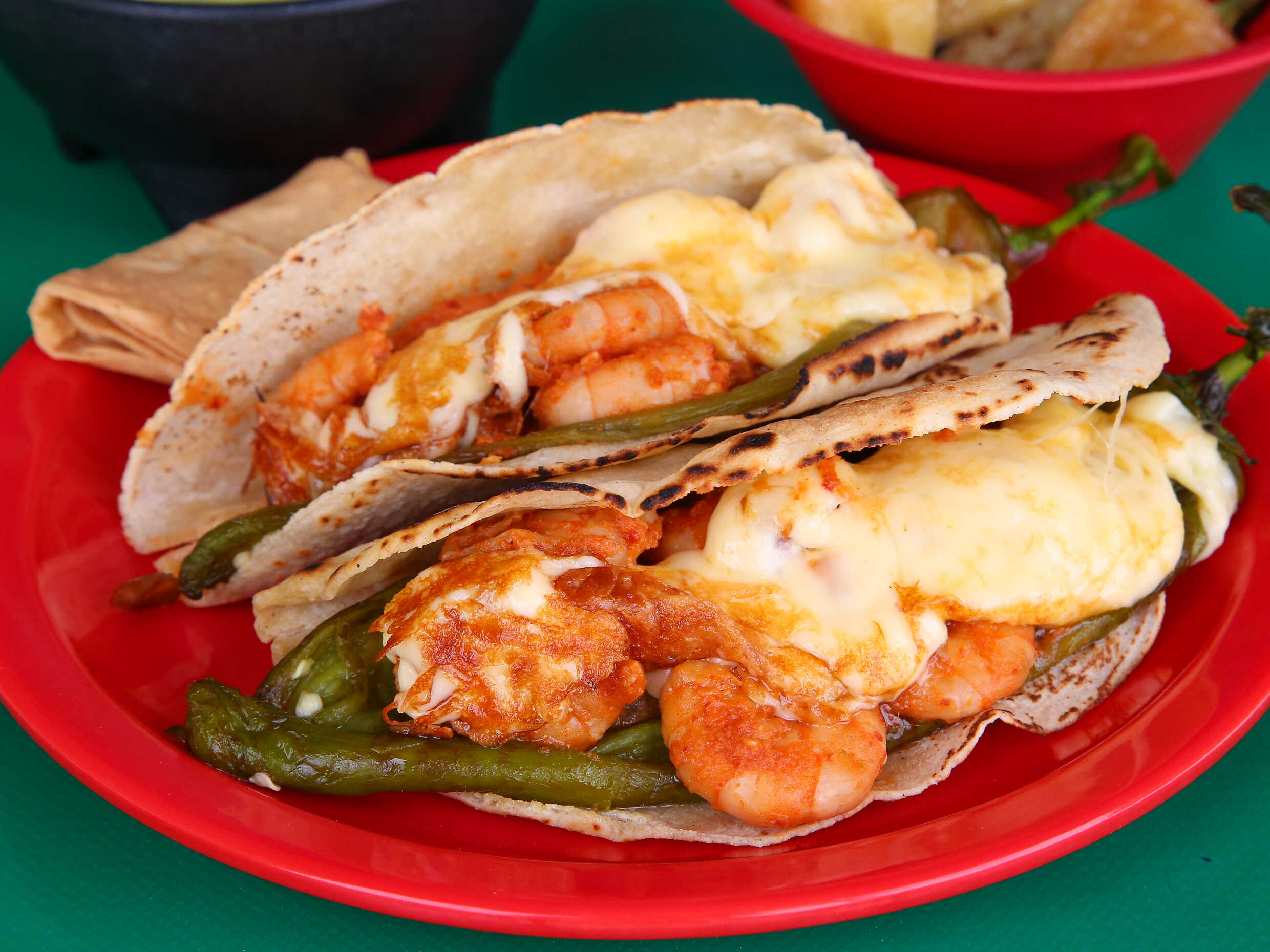 Tortilla de maiz recien hecha dorada en el comal con camarón capeado y gratinado con chile jalapeño. sin complementos