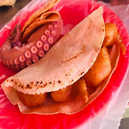 Tortilla de maiz recien hecha con pulpo capeado. sin complementos