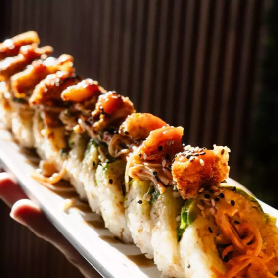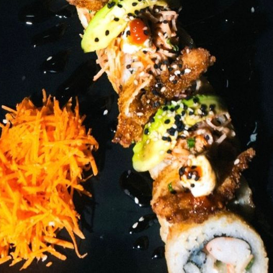 Rollo relleno de res, camarón alga, pepino, phila y aguacate. Por fuera gratinado con queso, coronado con tampico, topping de pollo empanizado con salsa especial, cubos de aguacate y bañado en salsa de anguila y ajonjolí