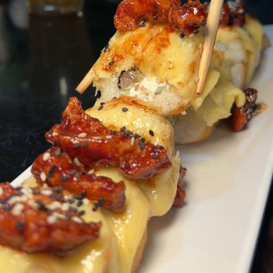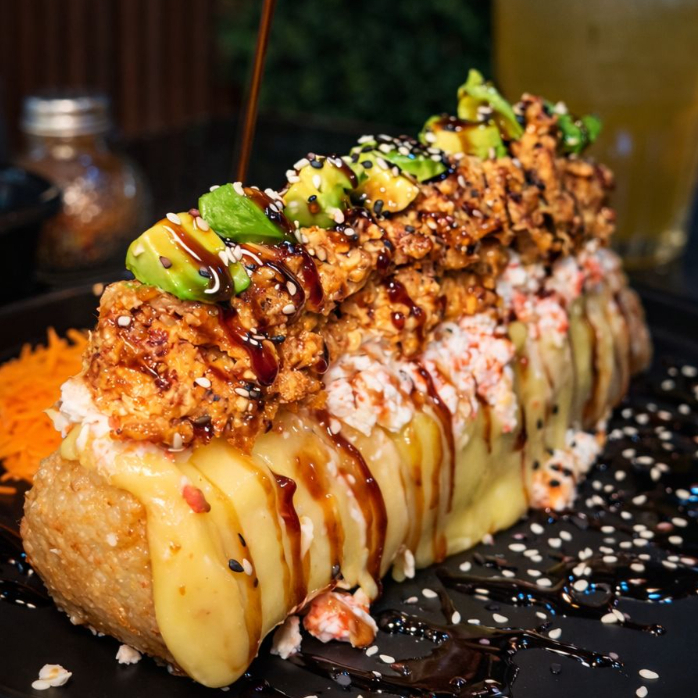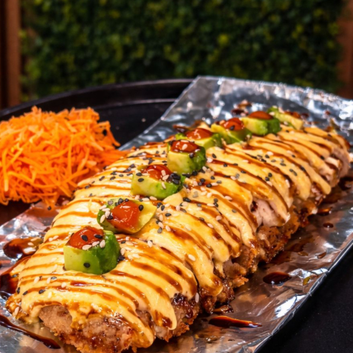 Rollo relleno de res, tocino, alga, pepino, phila y aguacate. Por fuera queso gratinado con topping de pollo empanizado bañado en salsa especial, tiras de aguacate y ajonjolí.