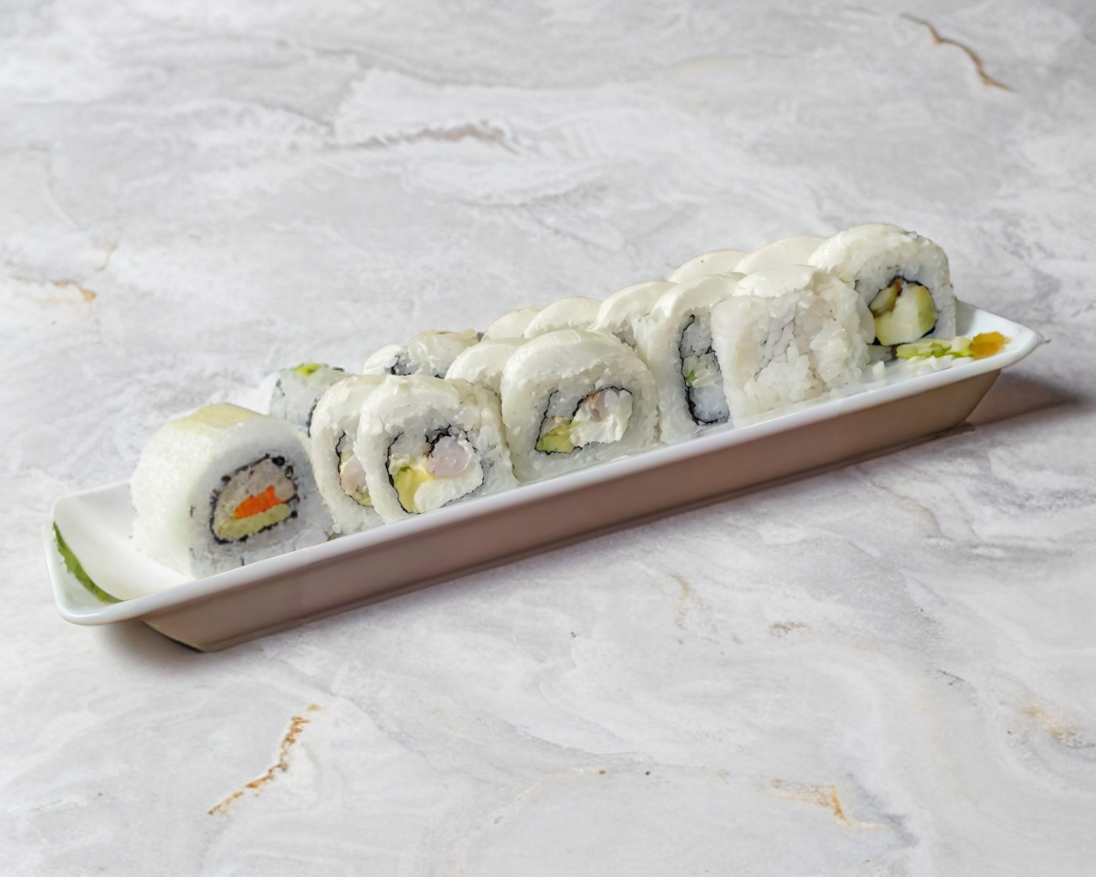 relleno de camaron,phila,aguacate y pepino por fuera cubierto de philadelphia