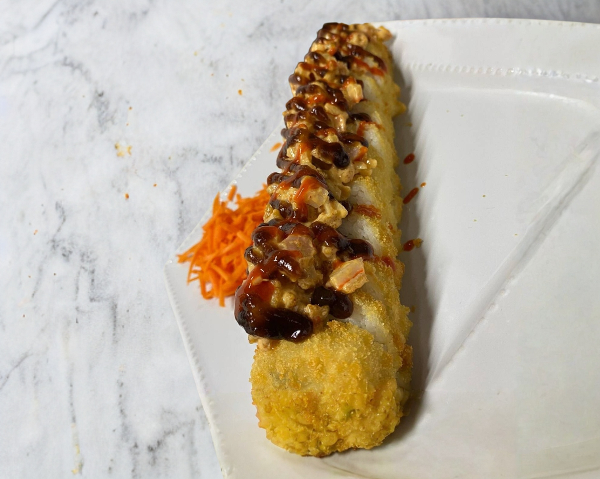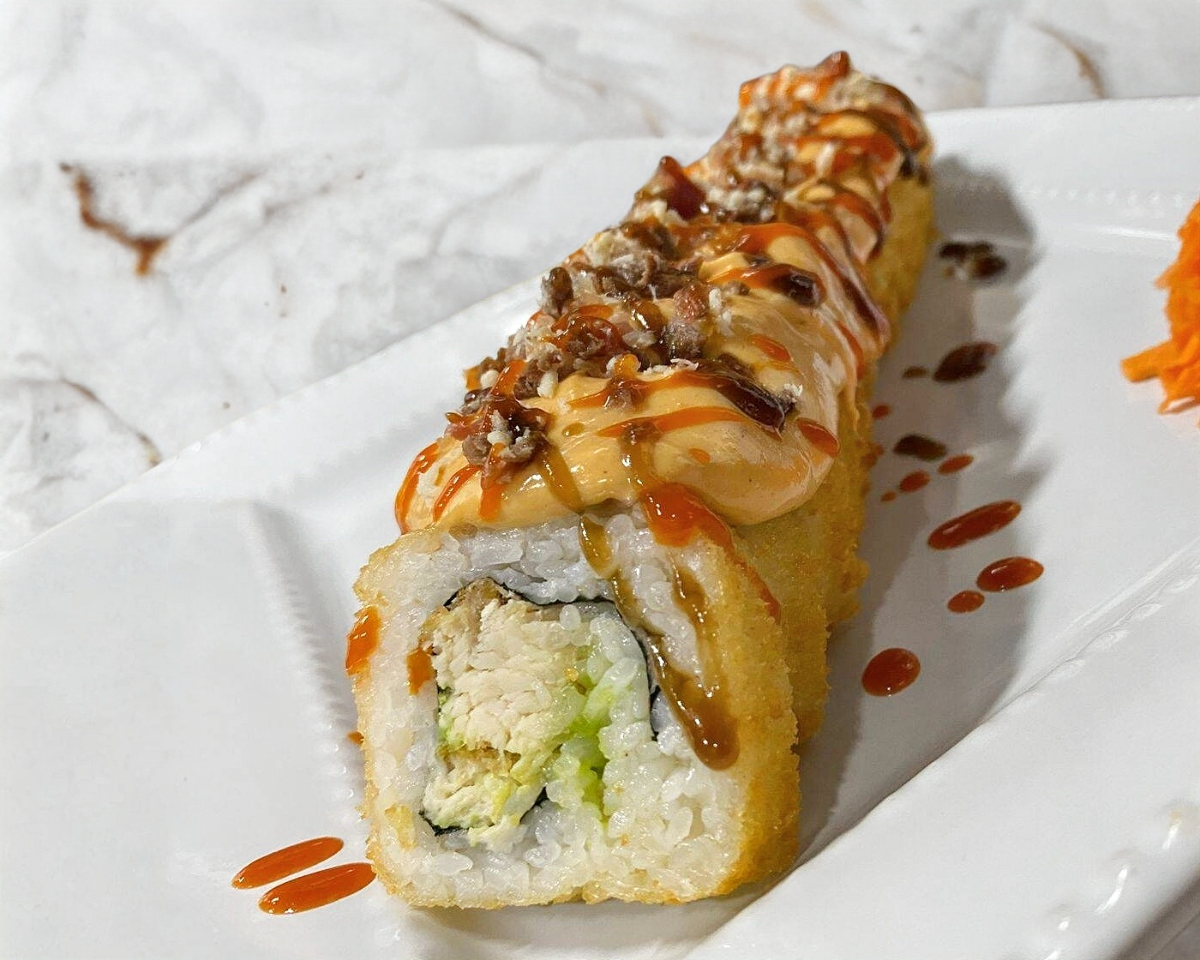 relleno de phila,aguacate,pepino y pollo por fuera gratinado spicy con salsa anguila y sirracha