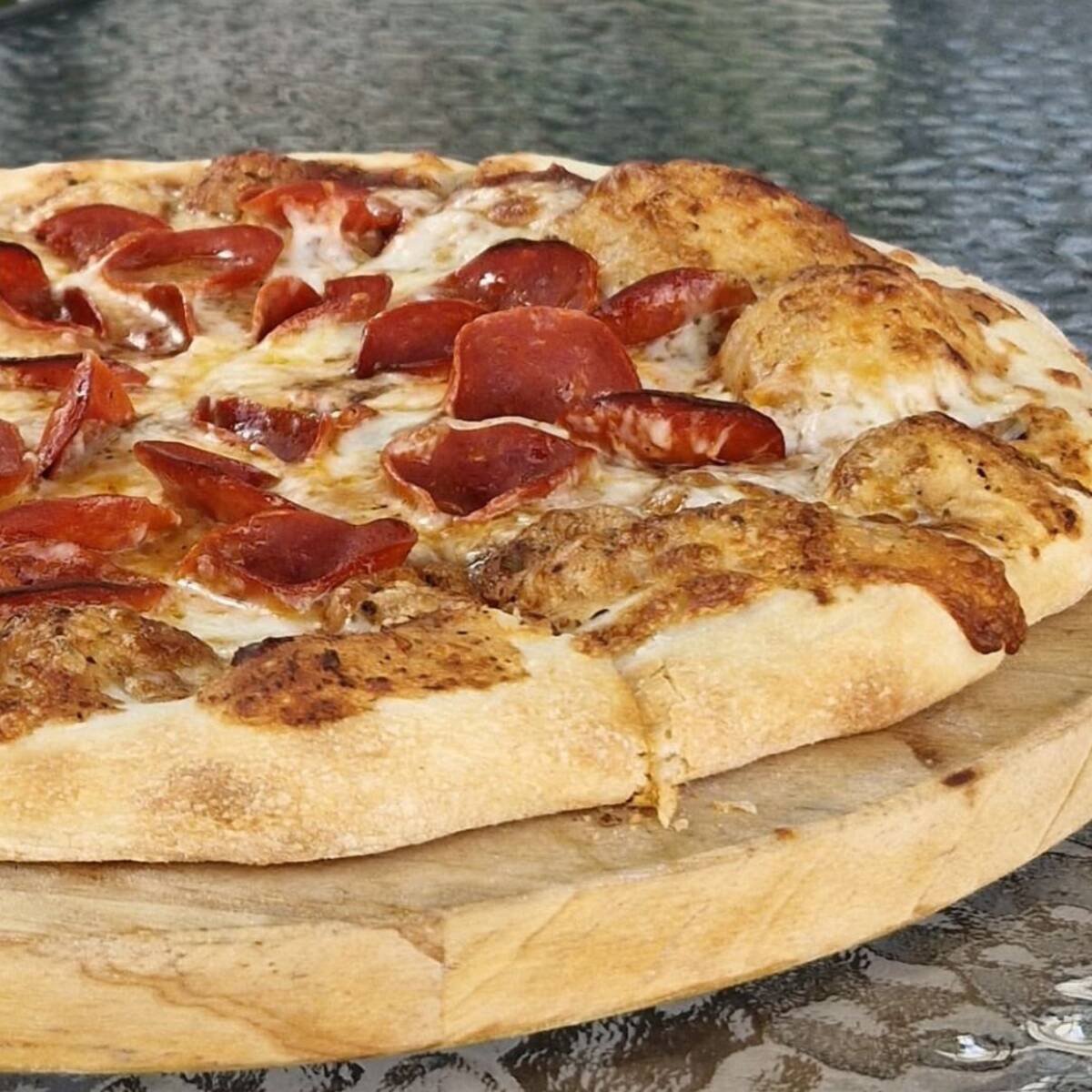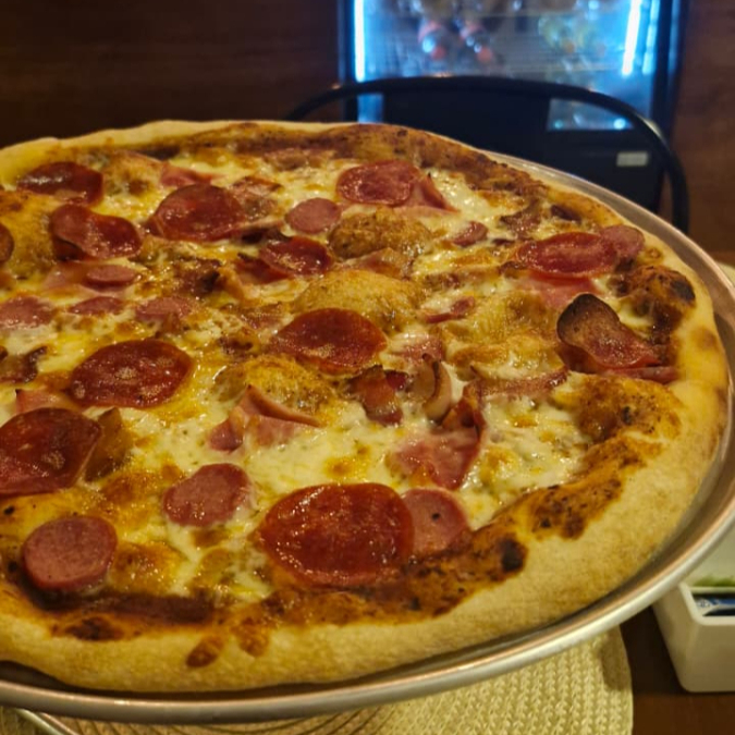 Pepperoni , tocino, salchicha y jamón.