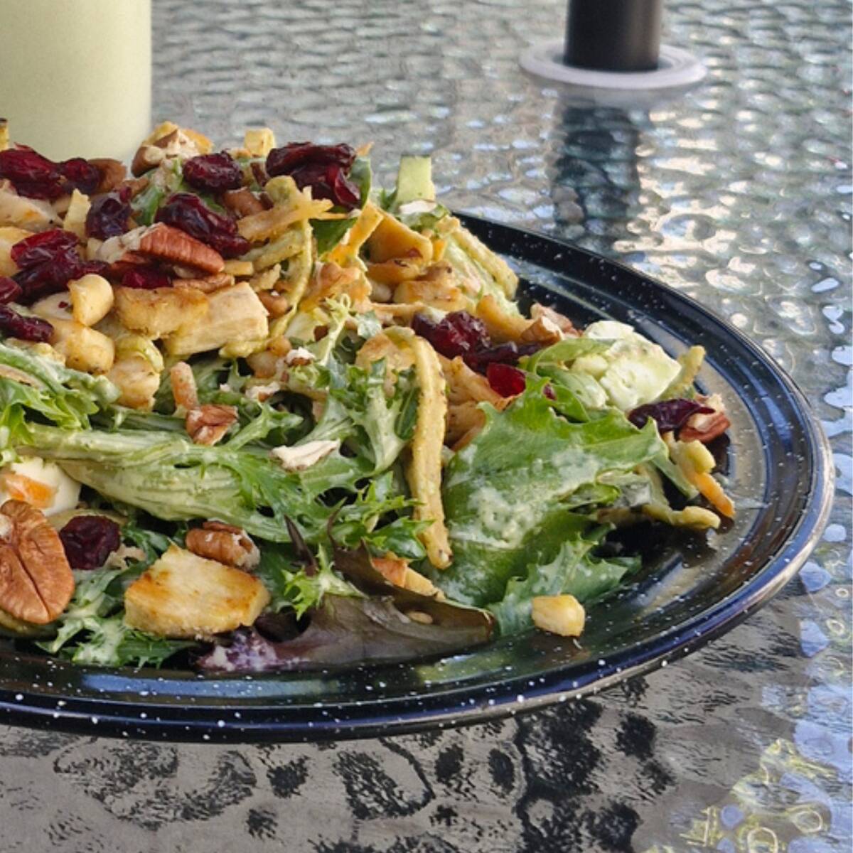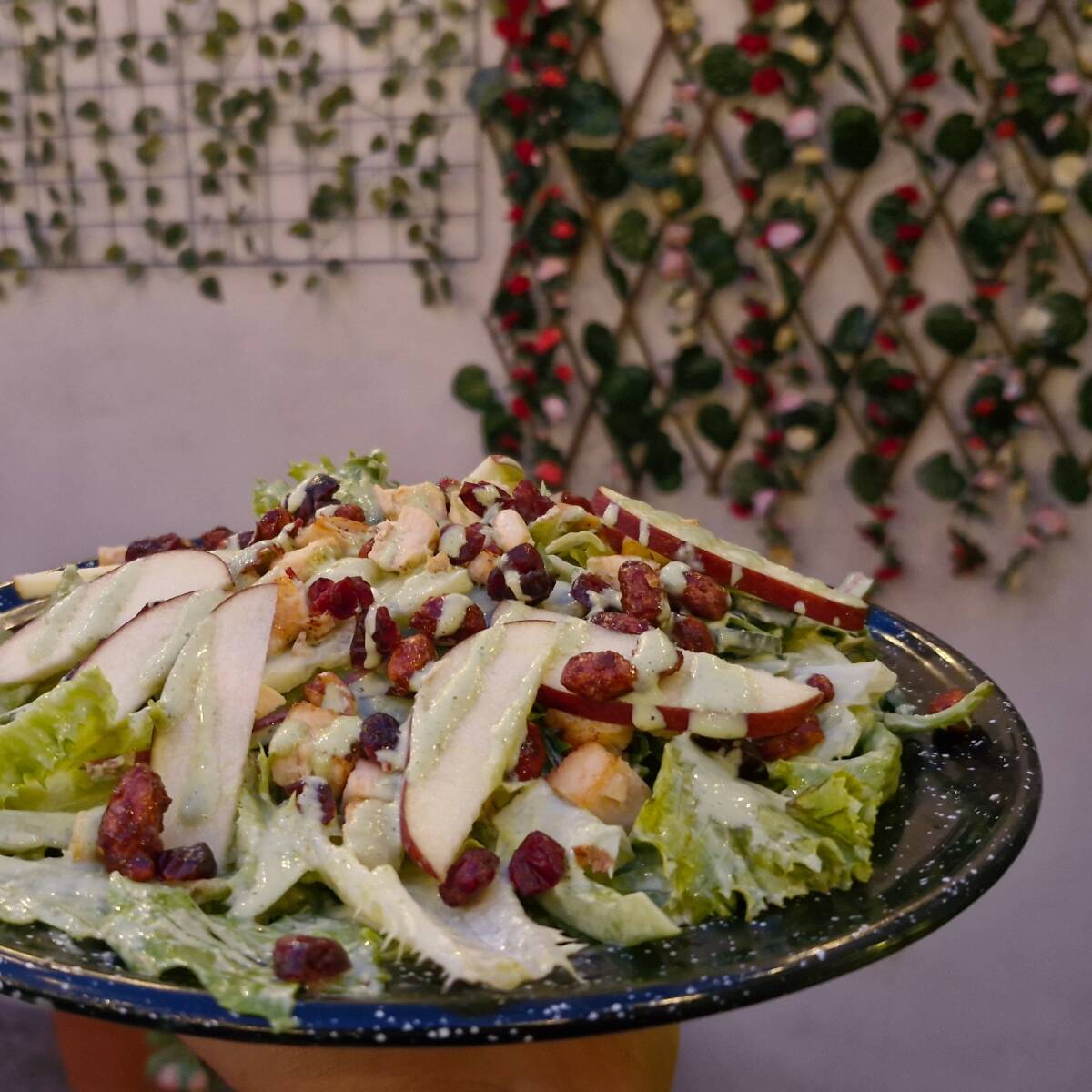 Mix de lechugas, pimiento morrón, manzana roja, arándano, cacahuate garapiñado, crotones, aderezo de cilantro y pollo a la plancha.