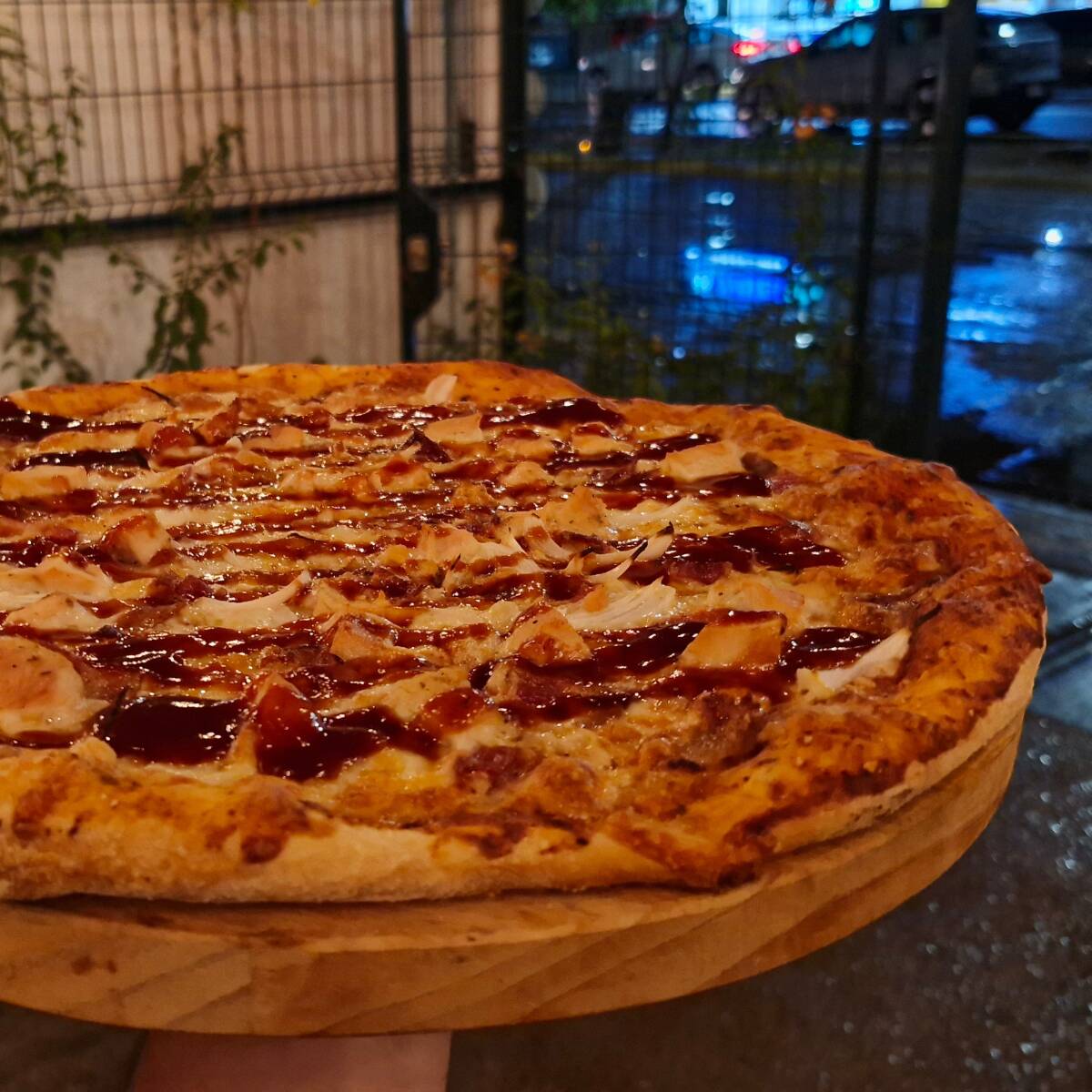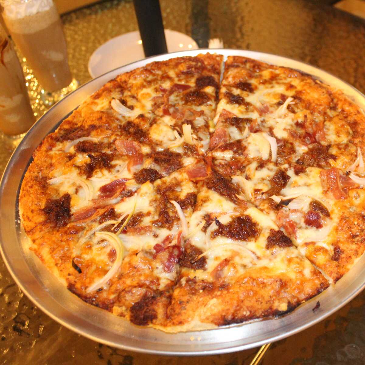 Pollo, cebolla, tocino y salsa BBQ.