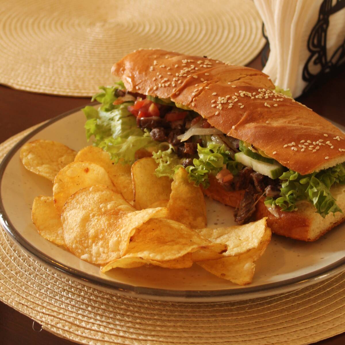 Relleno de carne asada, queso gratinado, cebolla asada, guacamole, lechuga, pepino, pico de gallo, acompañado de chips de papa.