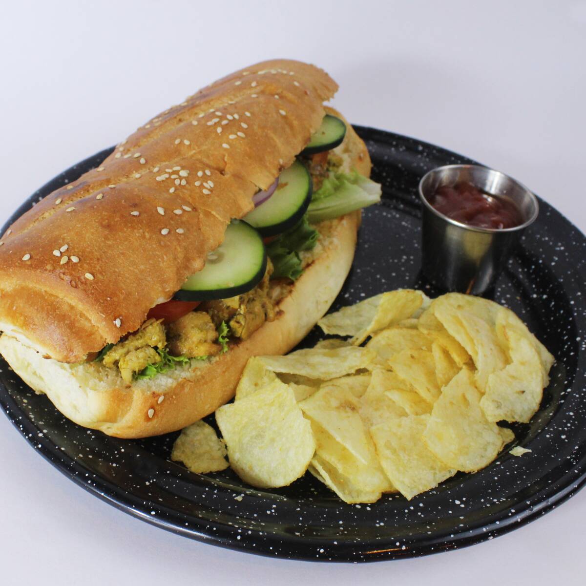 Relleno de pollo al pesto, mayonesa, lechuga, cebolla, pepino, tomate, acompañado de chips de papa.