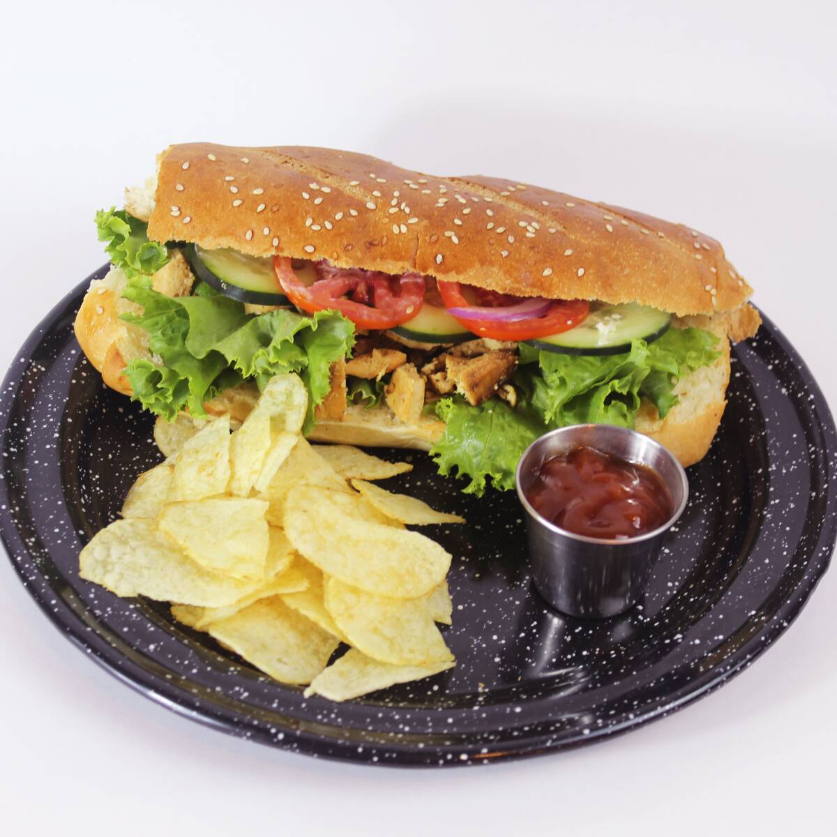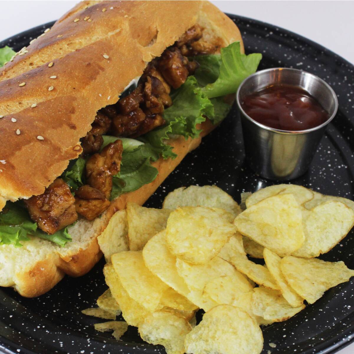 lleno de pollo con salsa BBQ, mayonesa, lechuga, cebolla, tomate, pepino, acompañado de chips de papa.