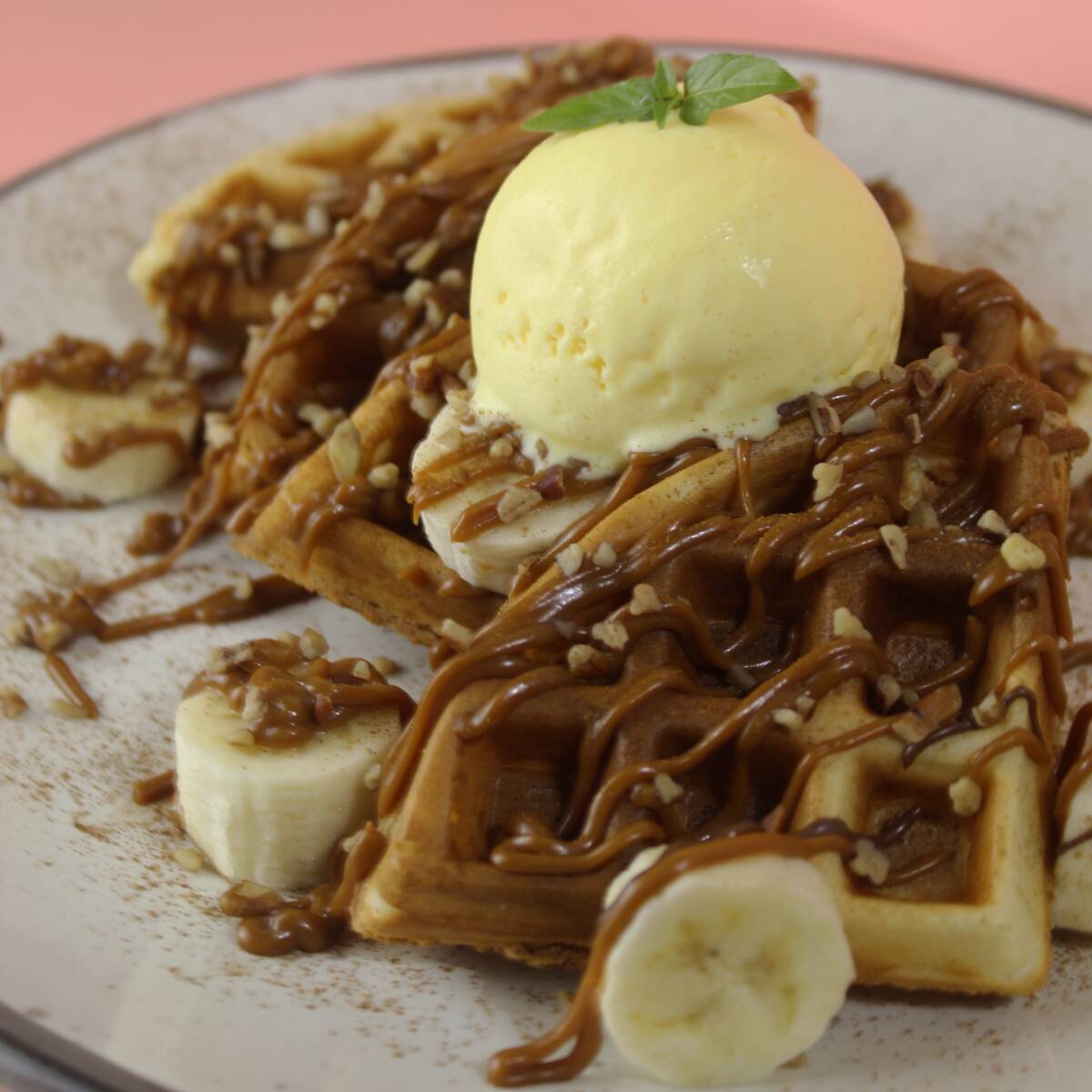 Waffle con plátano, nuez y nieve de vainilla bañados en dulce de leche.