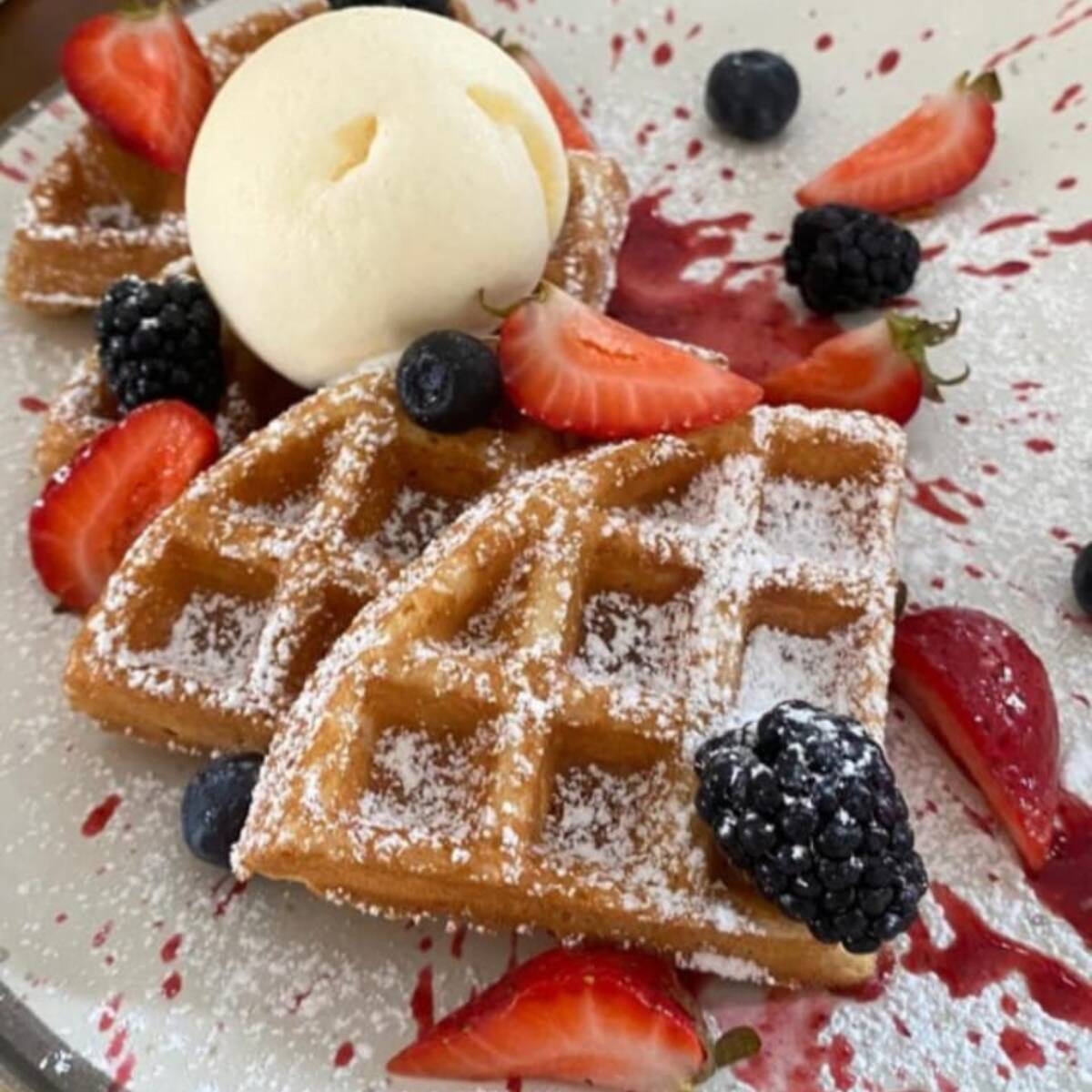 Waffle acompañado de frutos rojos, salsa de berrys y nieve de vainilla.