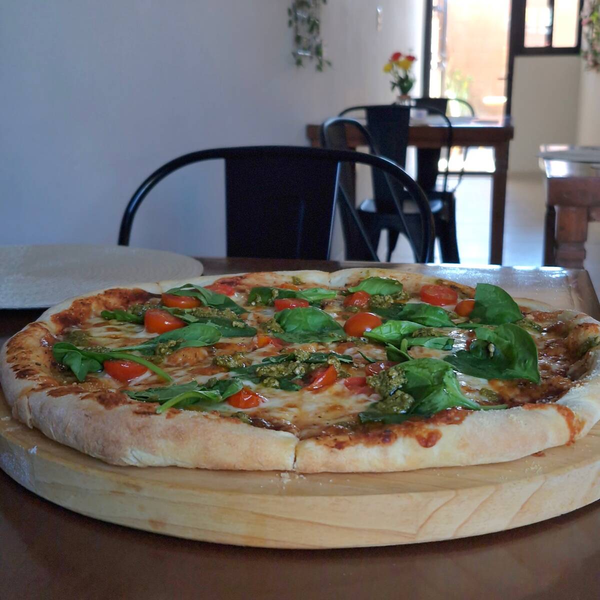 Tomate cherry, pesto de albahaca, espinaca y queso de cabra.