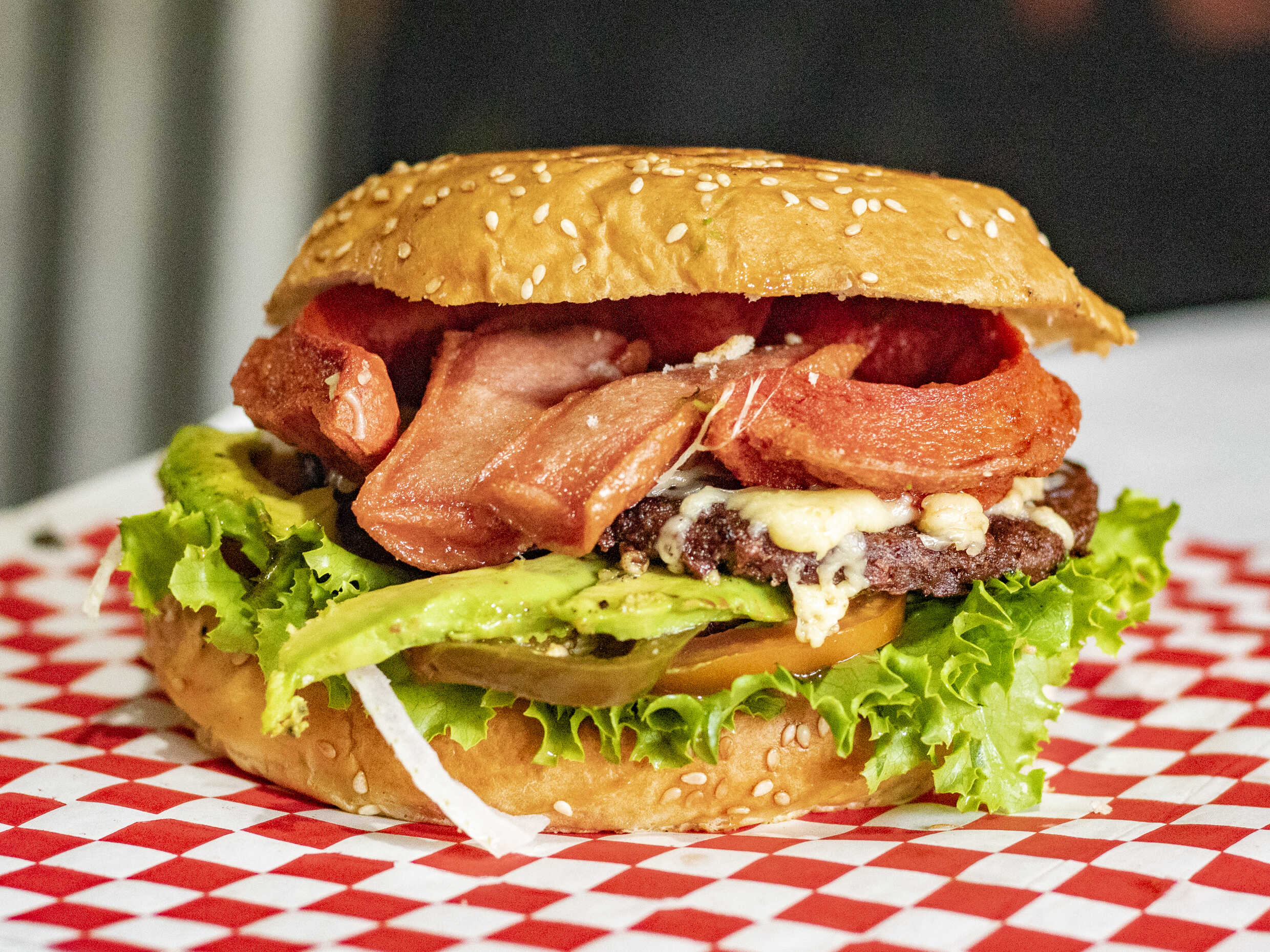 pan, carne, queso chihuahua, tocino, mayonesa, lechuga, tomate, cebolla, chiles, aderezo de salsa macha y catsup