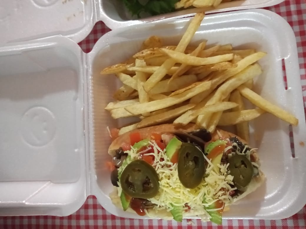 PAN, SALCHICHA DE PAVO, CARNE AL PASTOR, PIÑA, QUESO CHIHUAHUA, SUS VERDURAS, SUS ADERESOS Y PAPAS FRITAS.
