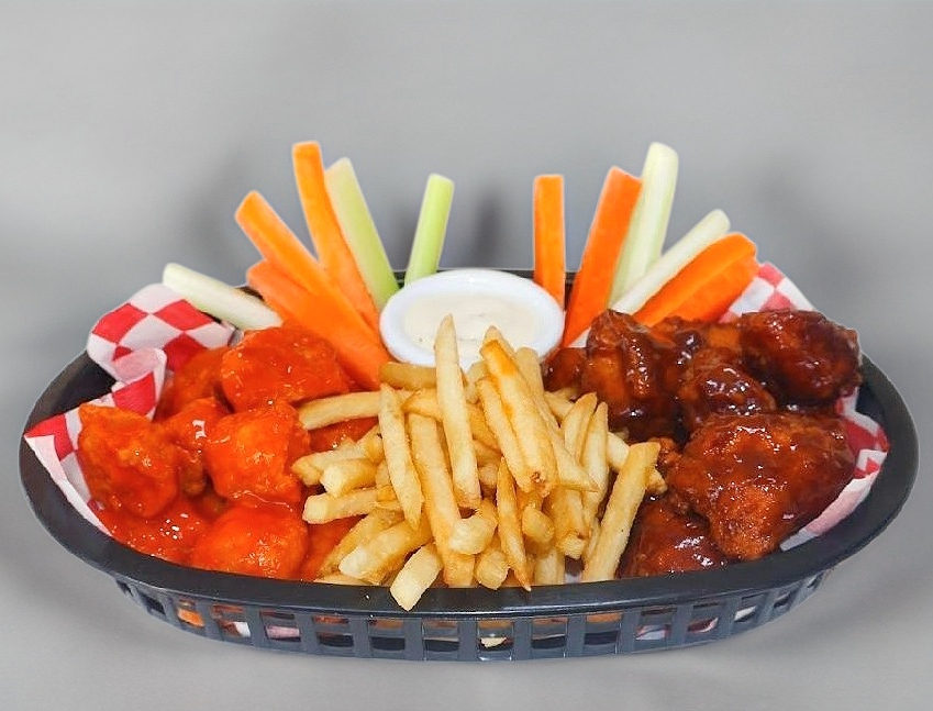 Boneless de pechuga de pollo acompañados de papas fritas, varitas de apio, zanahoria y aderezo ranch.