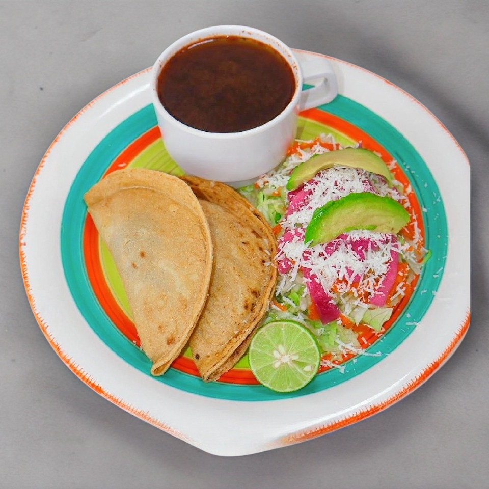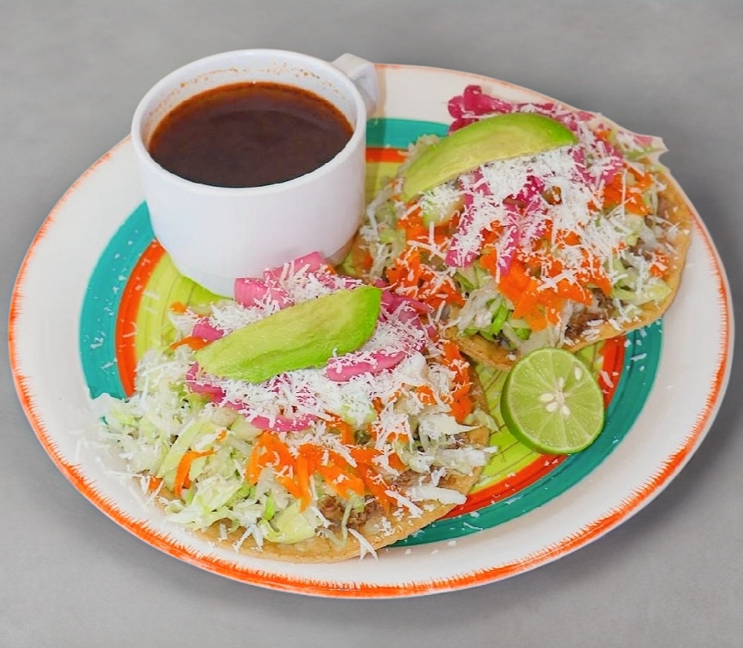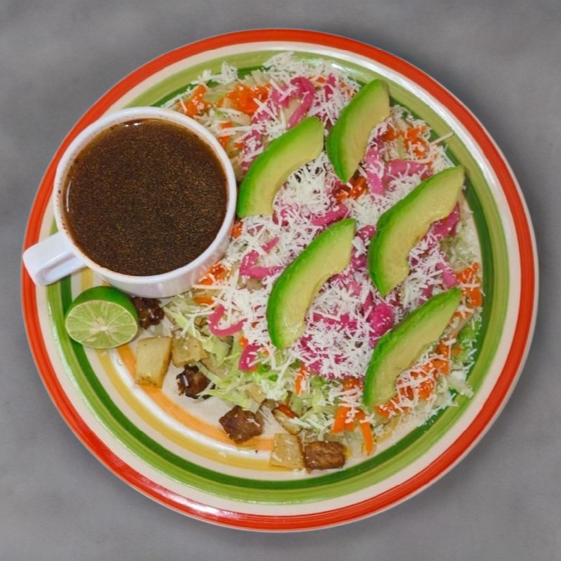 Platillo tradicional de carne de res al estilo casero, acompañado de tostada y consomé de casa.