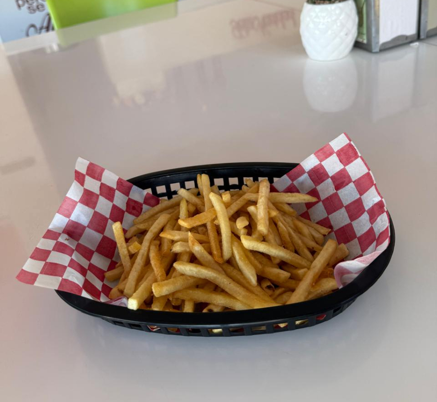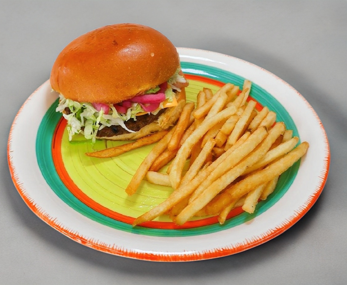 Hamburguesa de res con lechuga, tomate, cebolla y chiles jalapeños, acompañada de papas fritas.