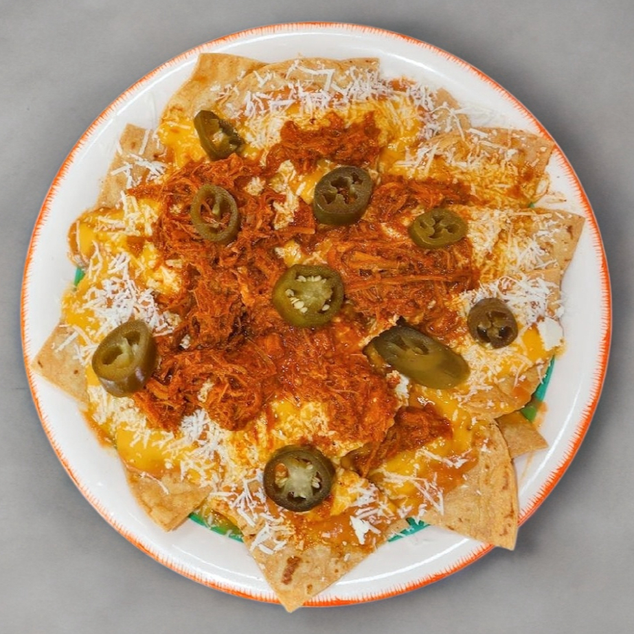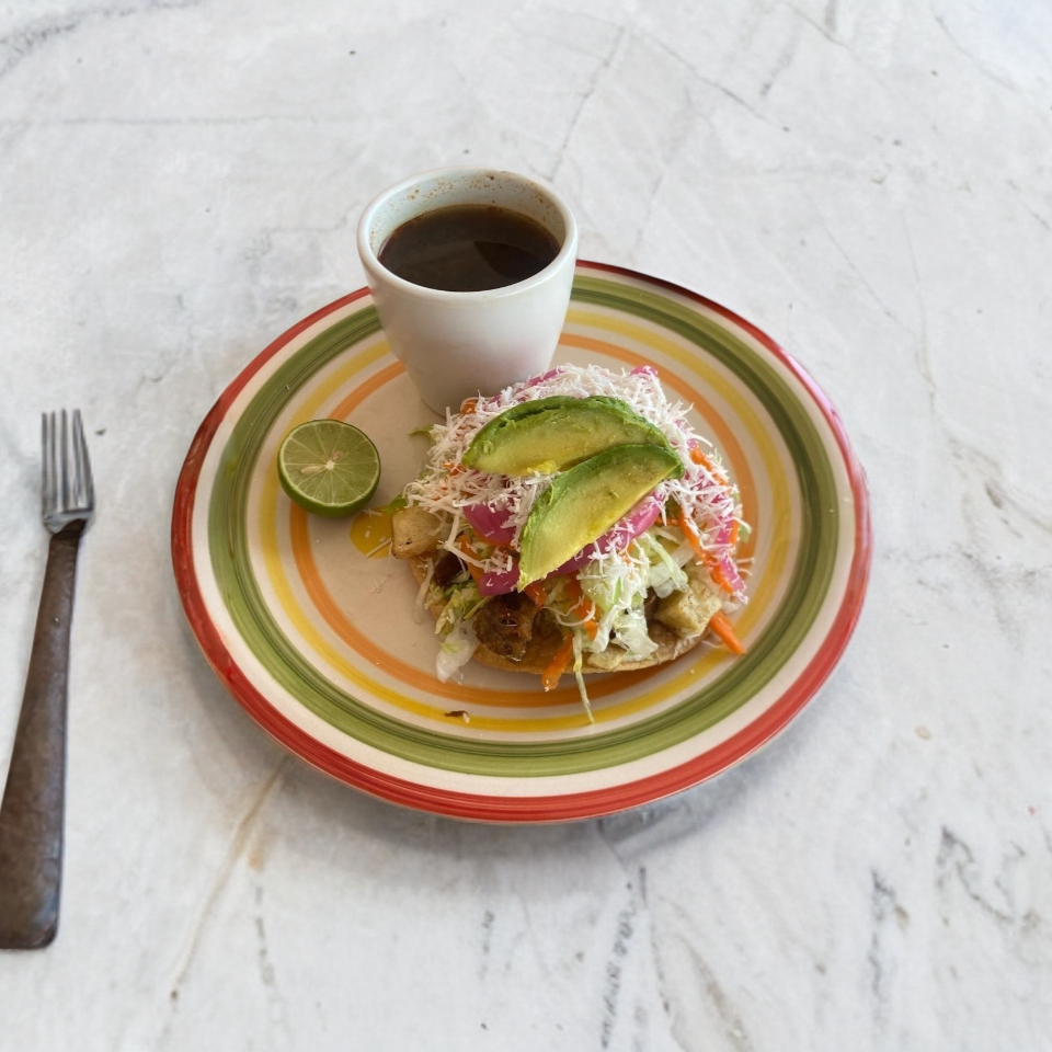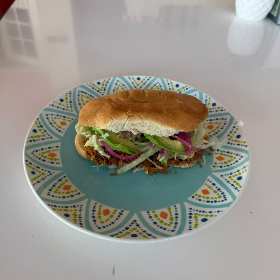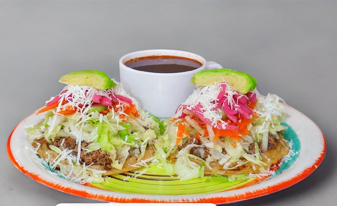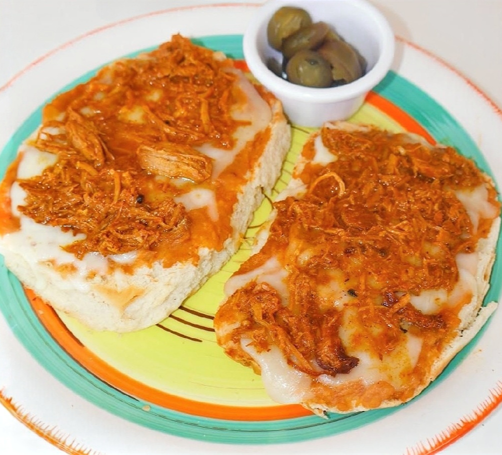 Pan telera con frijol puerco, queso gratinado y cochinita.