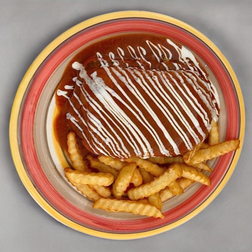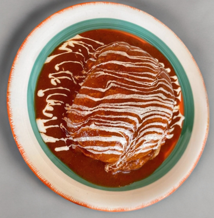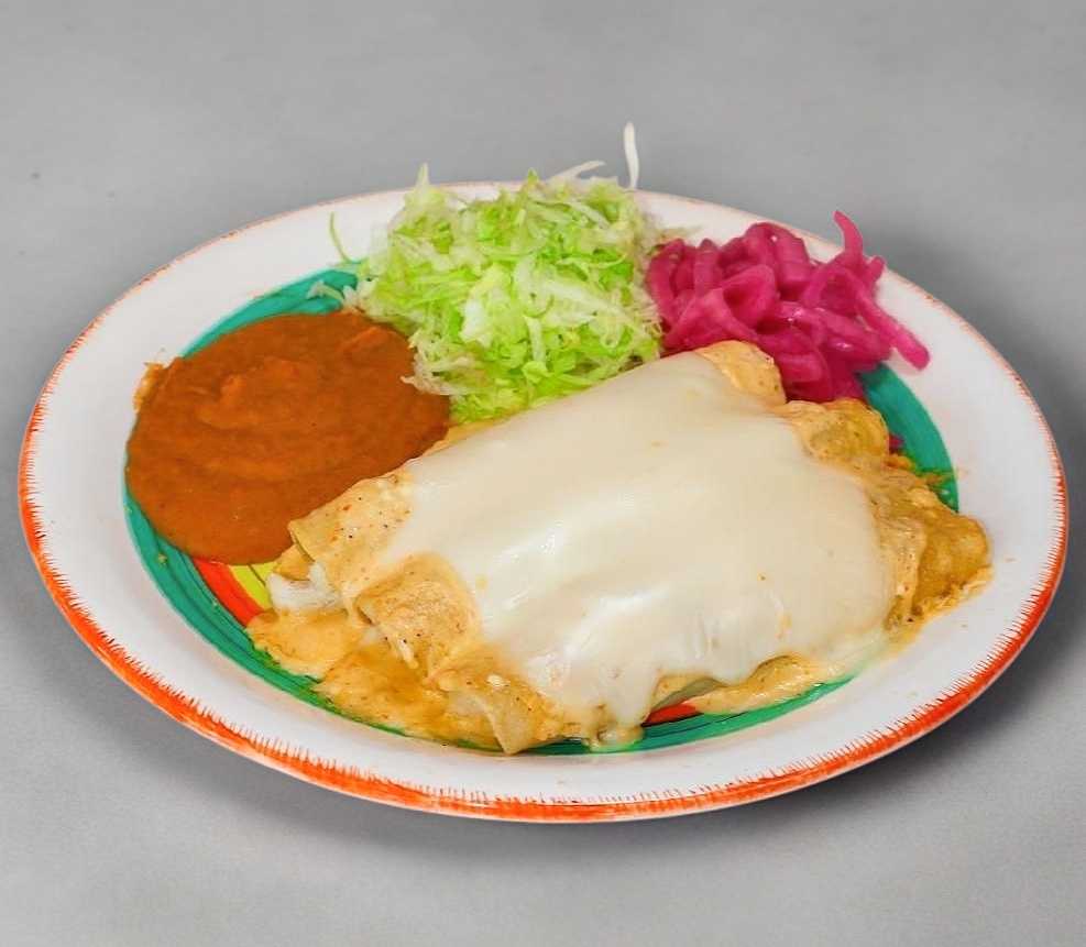 Enchiladas suizas, gratinadas con queso y pollo, acompañadas de frijol, lechuga y cebolla.