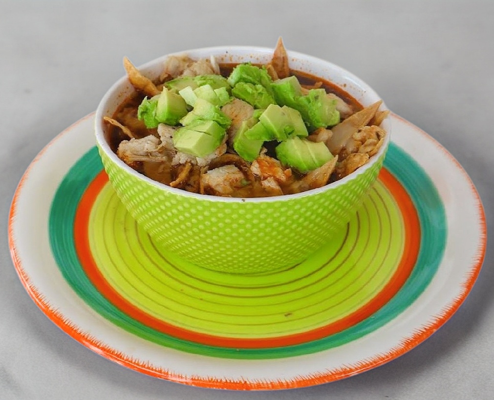 Sopa caliente con tiras de tortilla frita, pollo y queso.