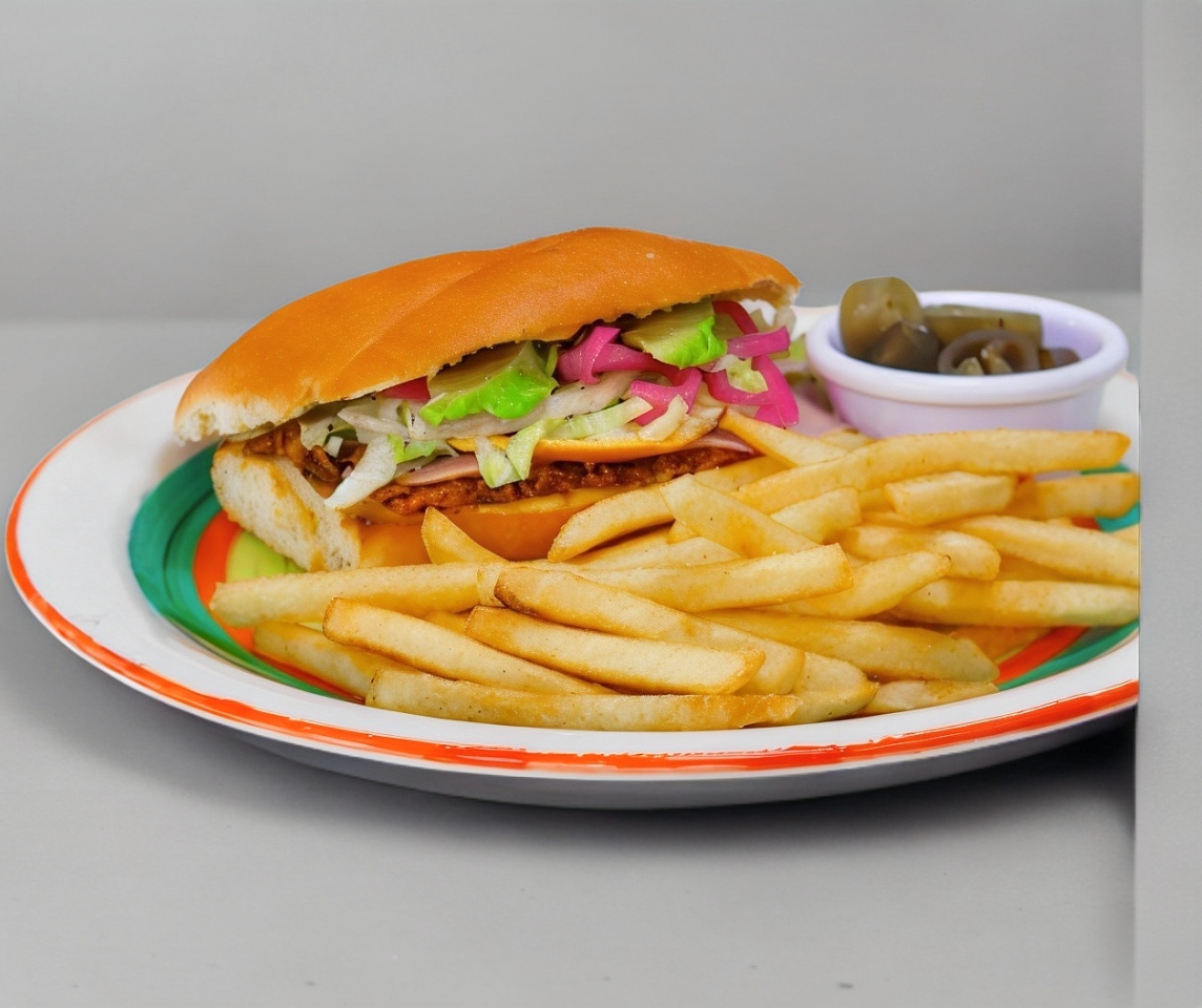 Torta de cochinita con lechuga, tomate, cebolla y chiles jalapeños, acompañada con papas fritas.