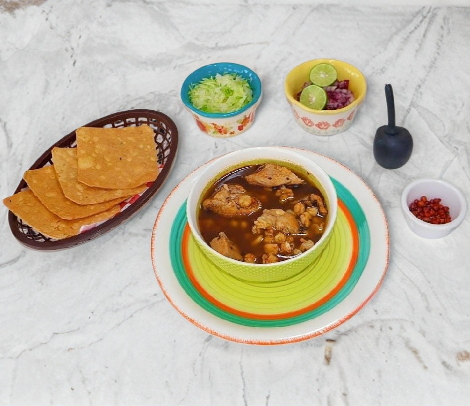 Pozole rojo tradicional con maíz, carne puerco, tostada, cebolla, lechuga y chiltepin.