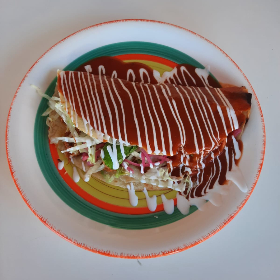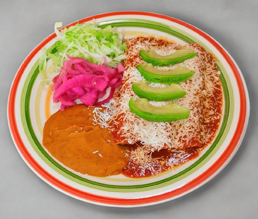 Enchiladas bañadas en salsa roja, acompañadas de frijol, lechuga y cebolla.