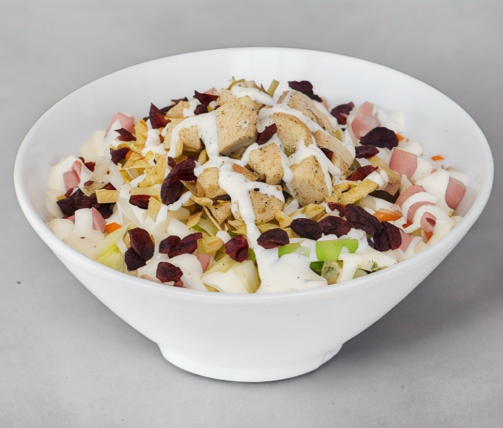 Deliciosa ensalada de lechuga, zanahoria, pepino, apio, arándano, fritura, queso, jamón y pechuga con aderezo ranch.