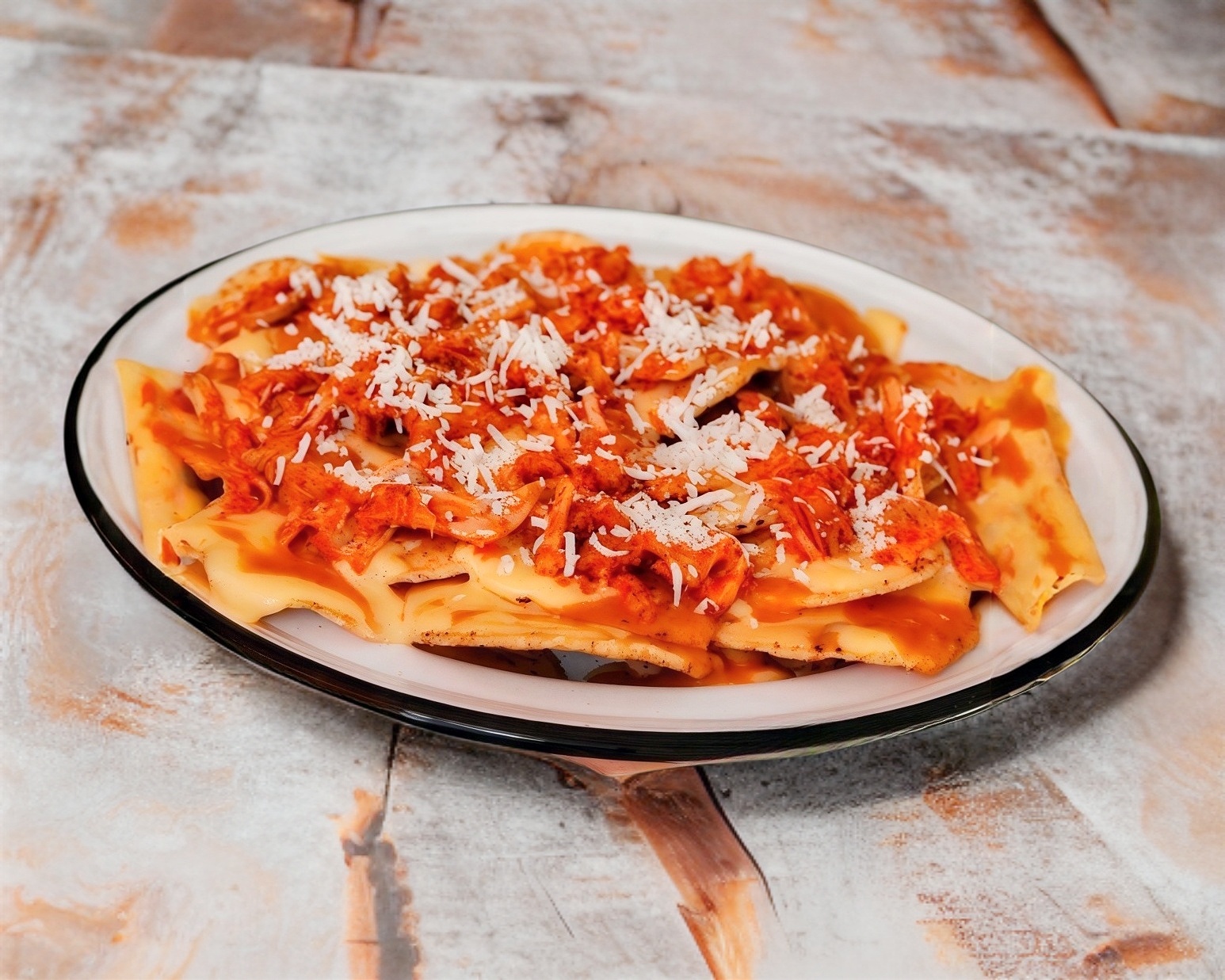 Tostitos bañados de frijol puerco, queso amarillo, cochinita y queso cotija.