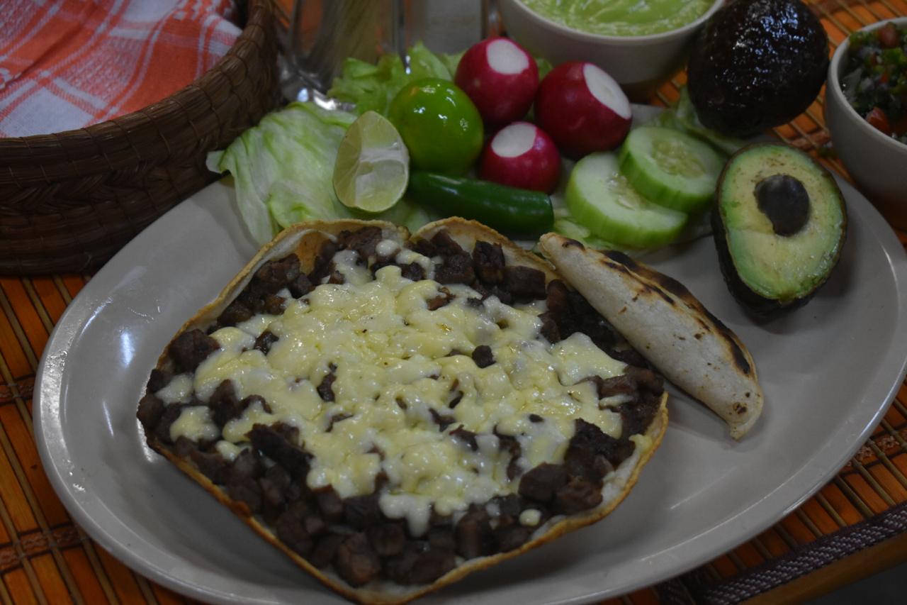 Tortilla de maíz dorada con carne a su elección y queso fundido. Incluye verdura, salsas, guacamole y cebollitas asadas. Va acompañado de nuestro tradicional taquito de frijol dorado cortesía de la casa.