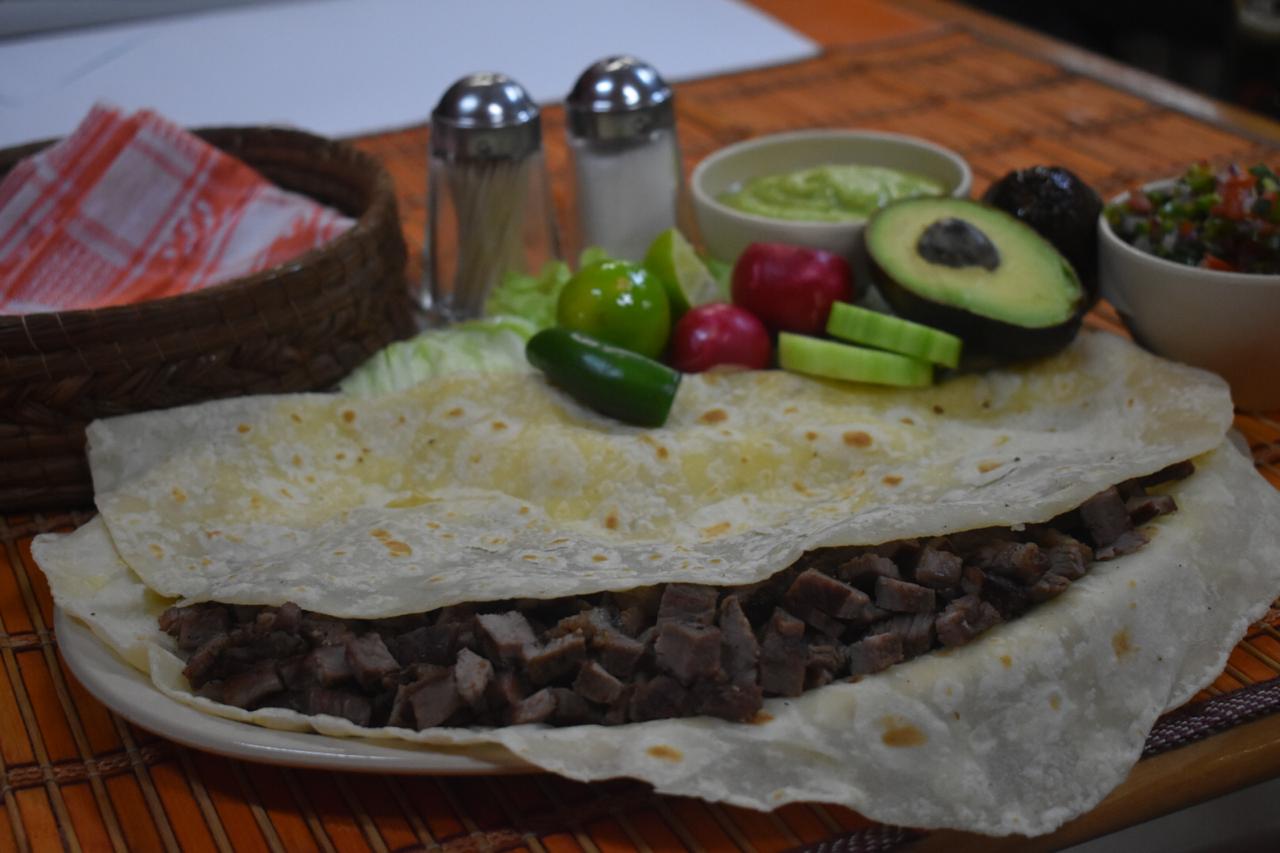 Deliciosa tortilla de harina rellena de queso y carne a su elección. Incluye verdura, salsas, guacamole y cebollitas asadas. Va acompañado de nuestro tradicional taquito de frijol dorado cortesía de la casa.