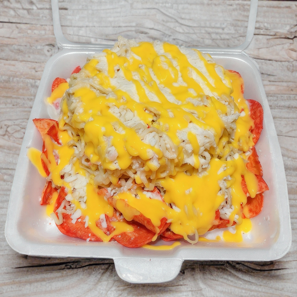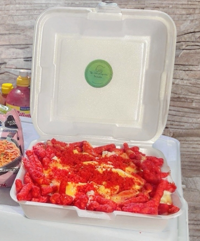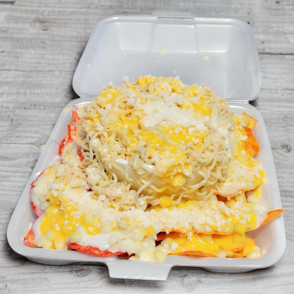 Ramen (Buldak) preparado con salsas, queso gratinado, Sabritas(a elegir) elote con crema,mayonesa,queso blanco, queso cheddar y polvo de sabritas, salsa a elegir.