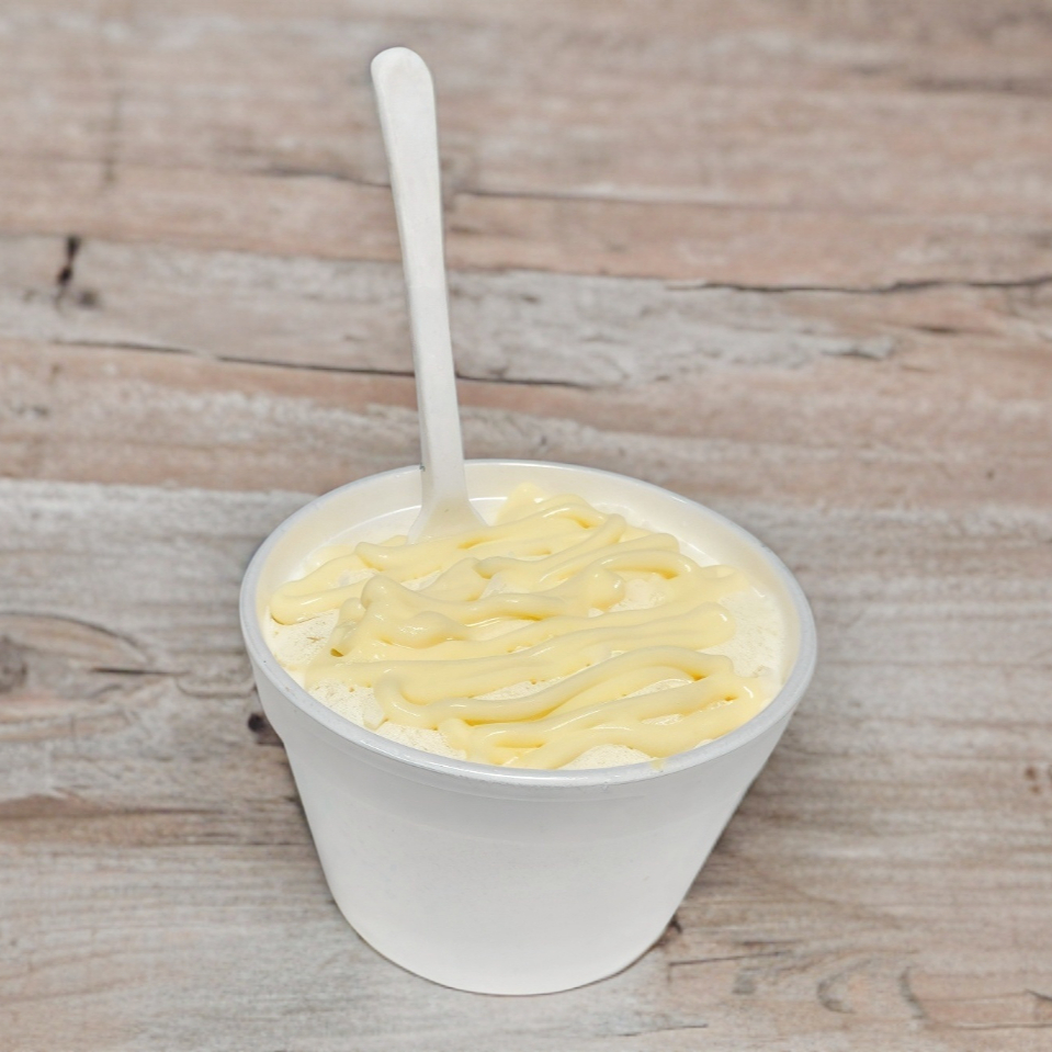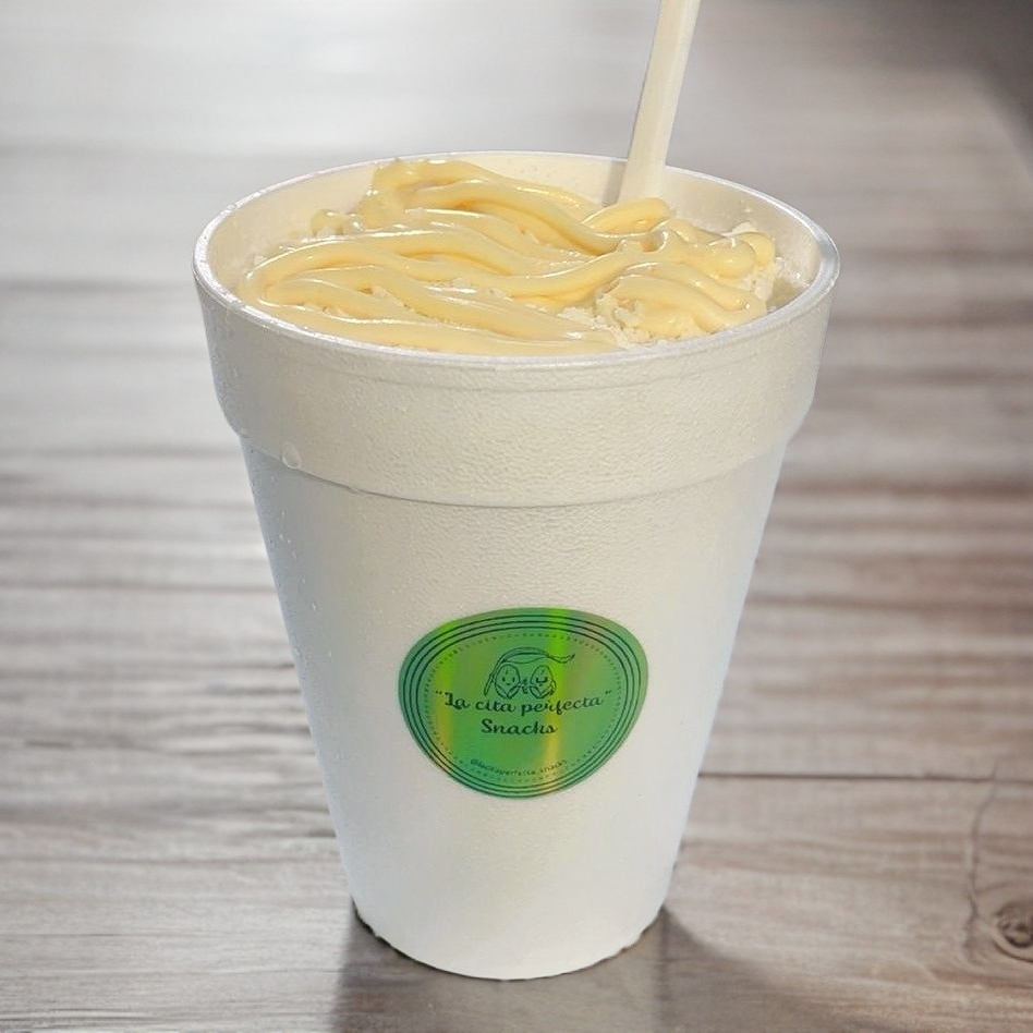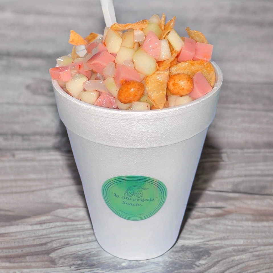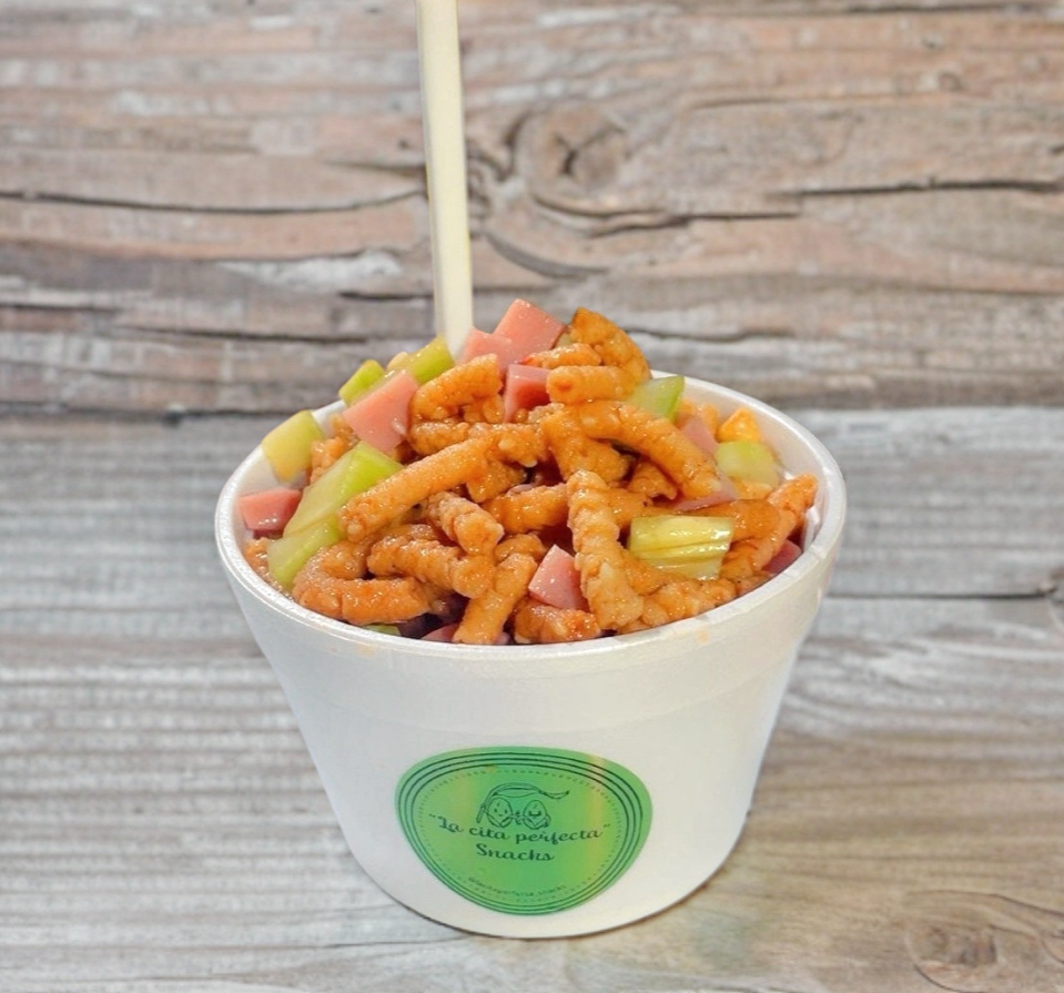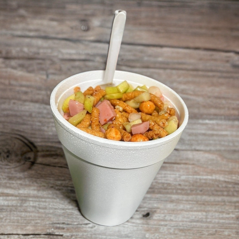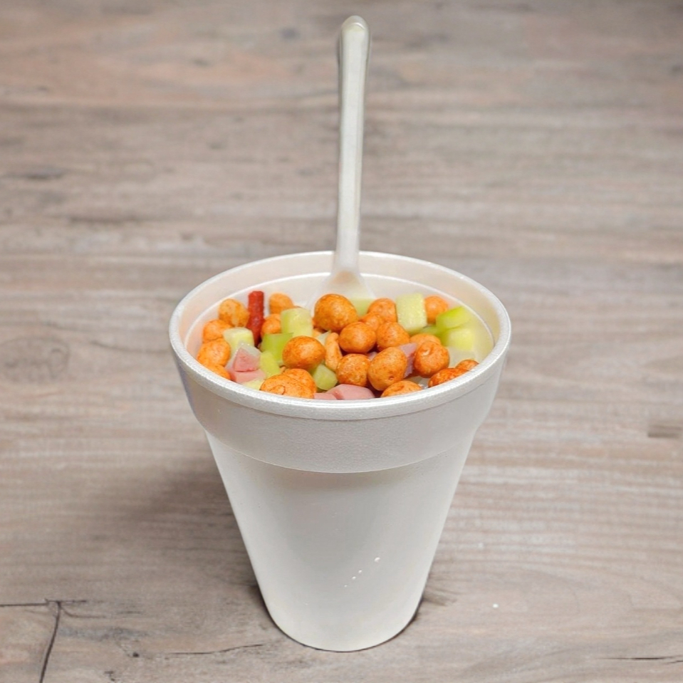 1/2 Litro de Esquite preparado con crema, queso, 1 sopa maruchan, 4 sabritas (a elegir), bañadas en crema,queso blanco,queso cheddar,polvo de sabritas y salsas a elegir.