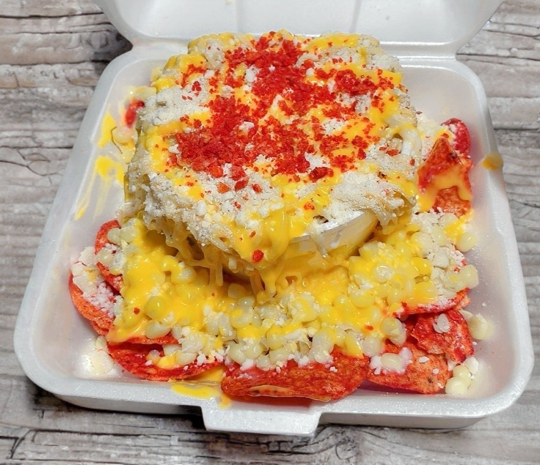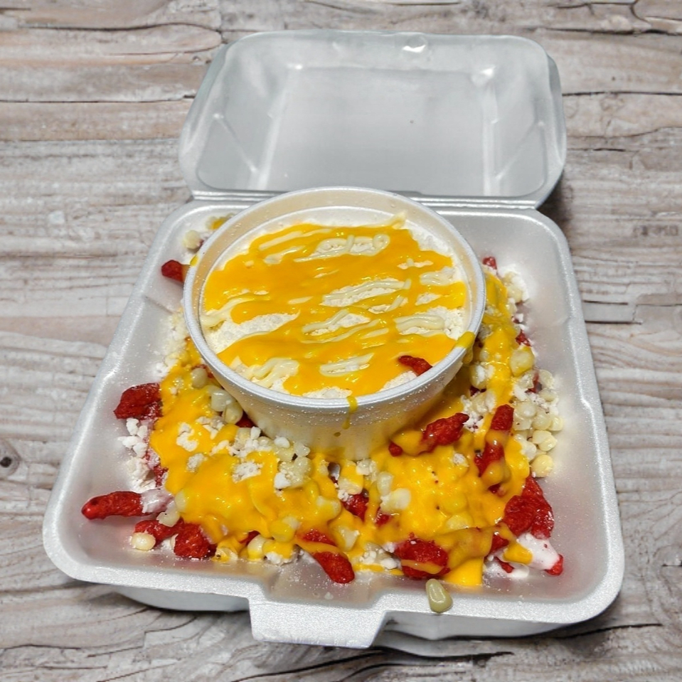 Elote preparado con tostitos, crema, queso blanco y queso Cheddar.