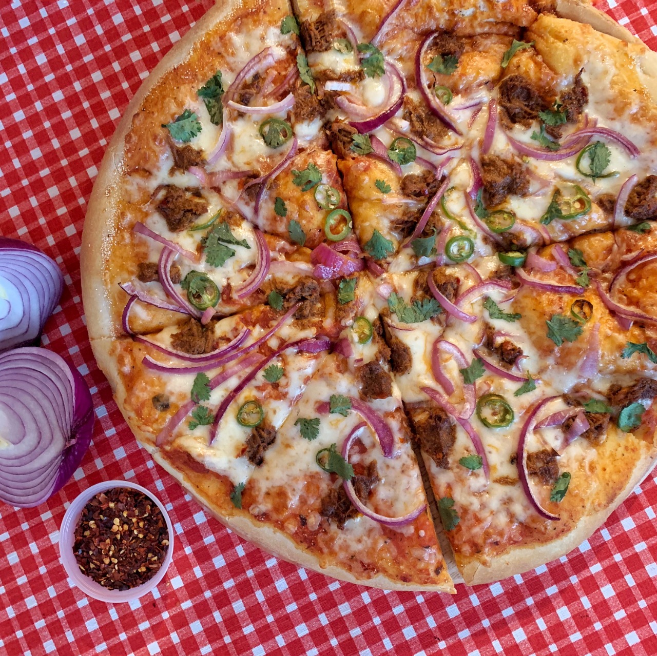 Queso 100% mozzarella, chilorio, cebolla morada y chile serrano.