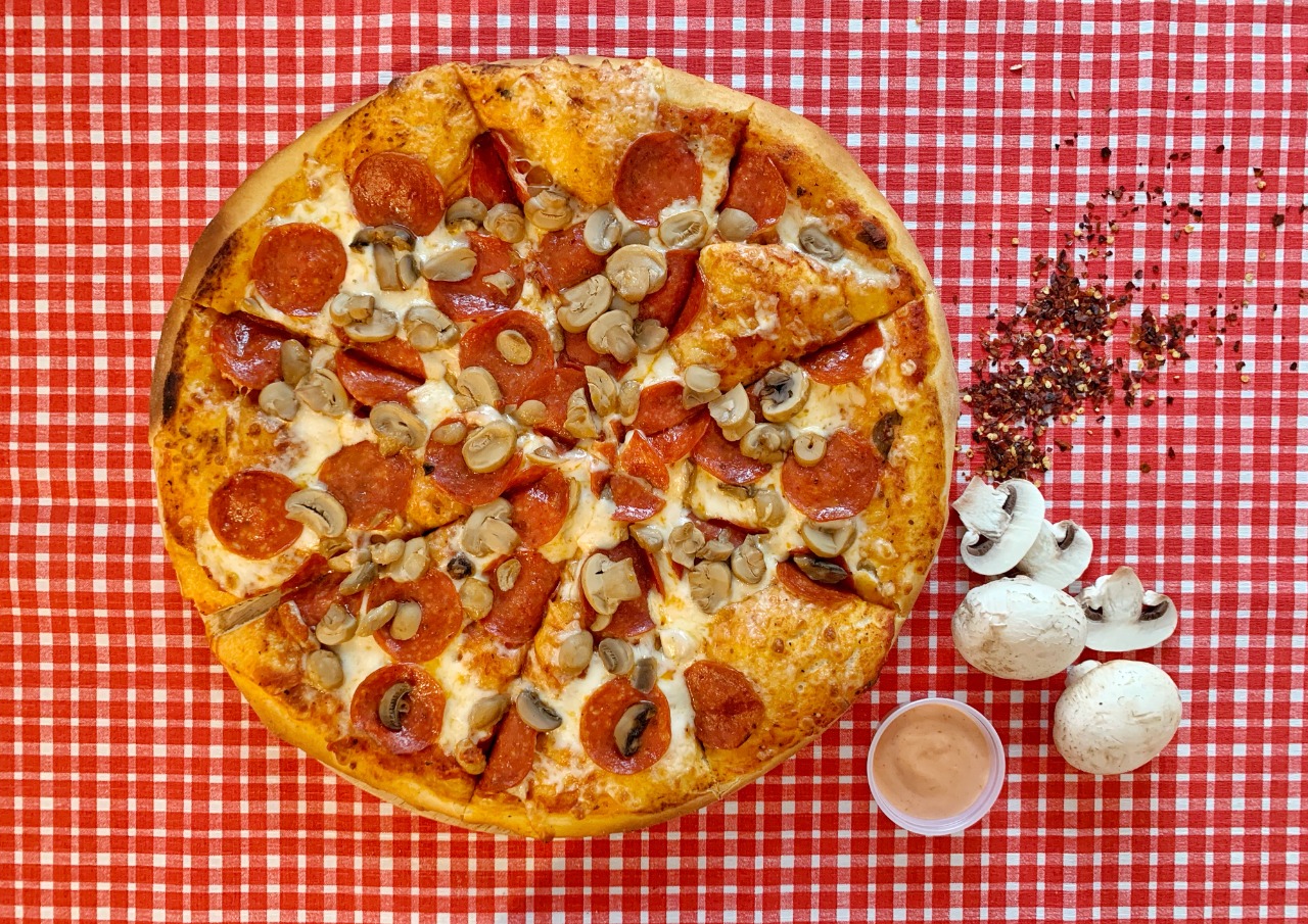 Queso 100% mozzarella, pepperoni y champiñones.