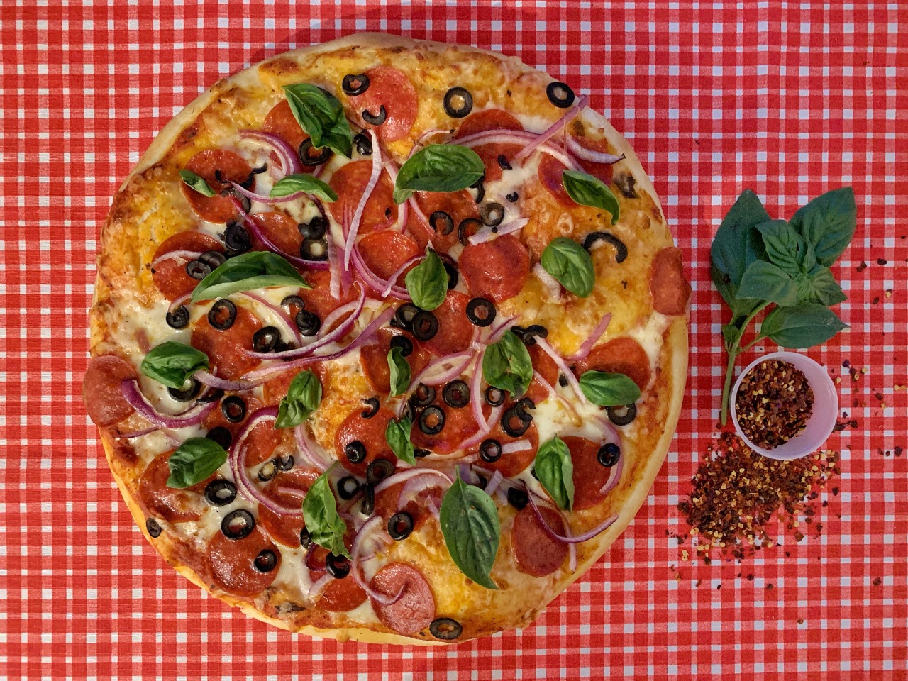 Queso 100% mozzarella, pepperoni, cebolla morada, aceituna negra y albahaca.