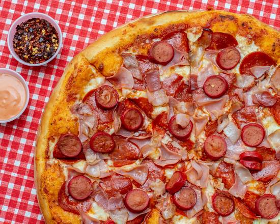 Queso 100% mozzarella, pepperoni, jamón, salchicha de cerdo y tocino.