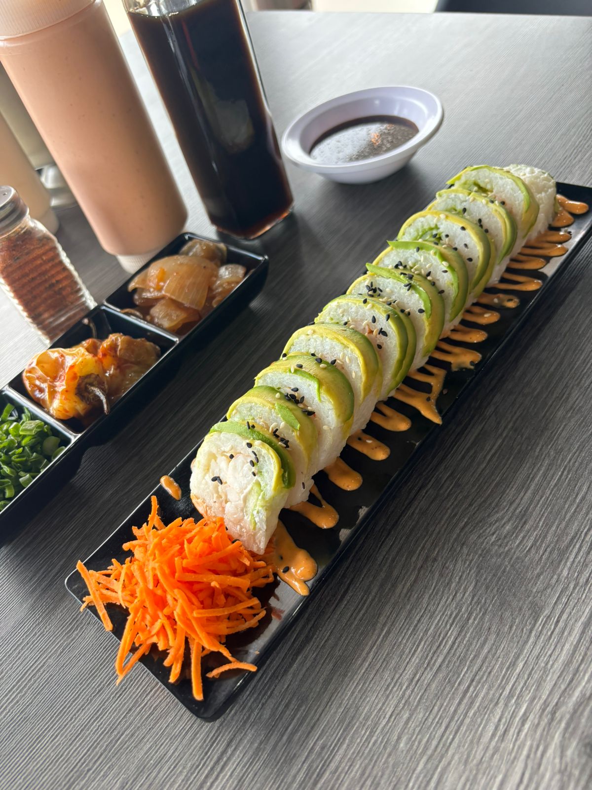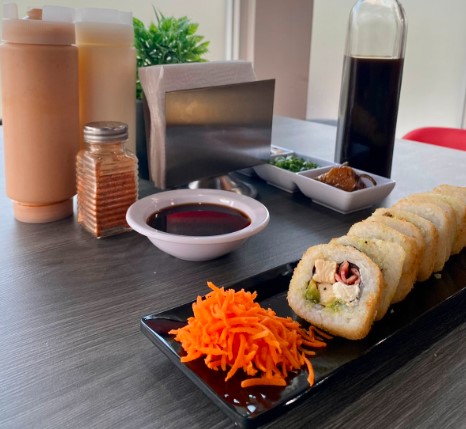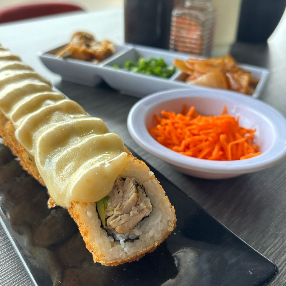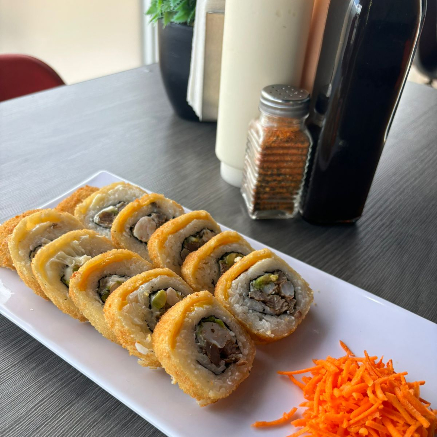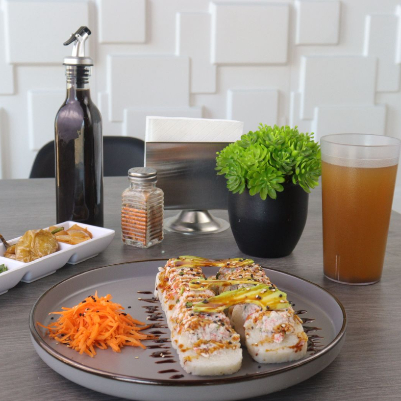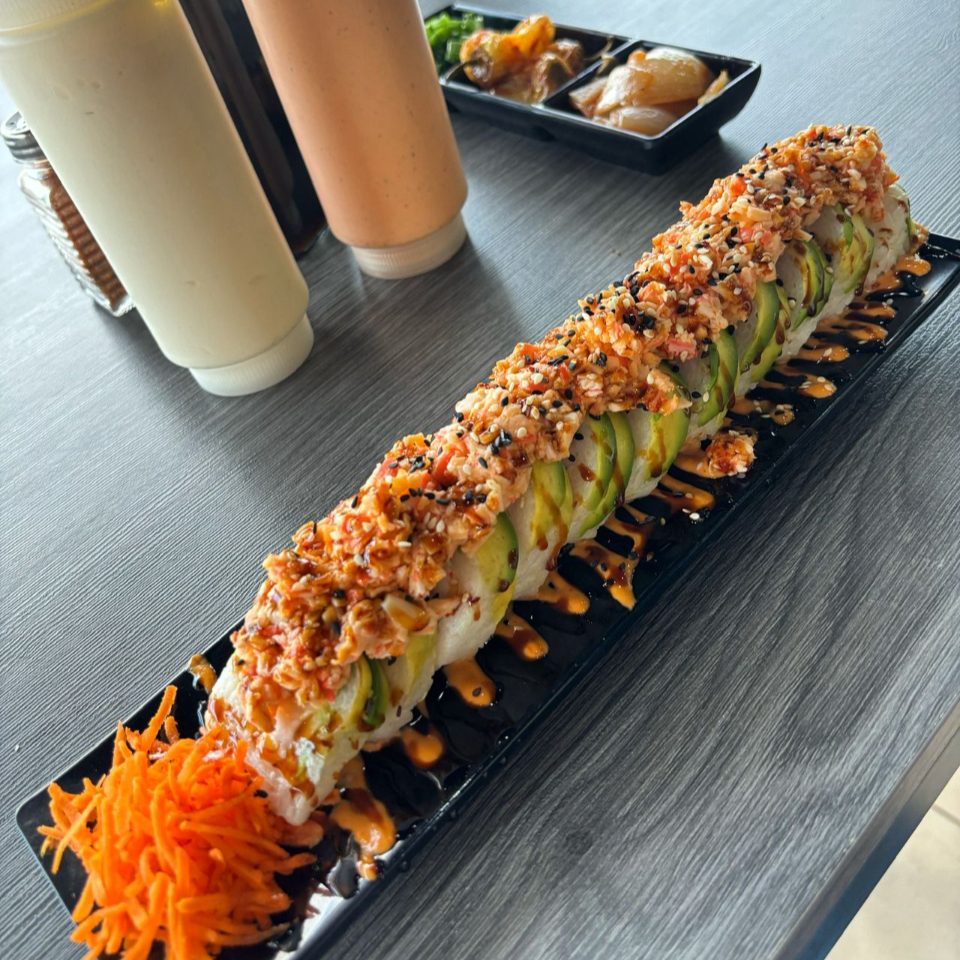 Relleno de res, tocino, philadelphia y pepino, forrado de aguacate, coronado con tampico spicy, salsa de anguila y ajonjoli.
