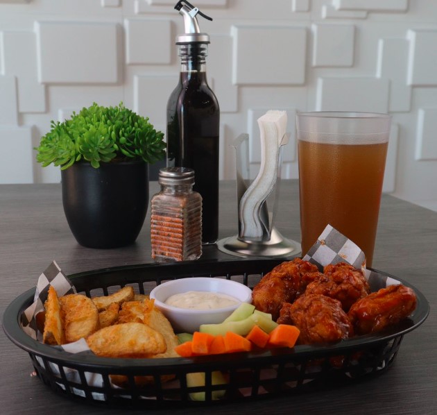 10 piezas de pollo capeado con salsa a elegir, BBQ o mango habanero, acompañado de papas gajo y vegetales.