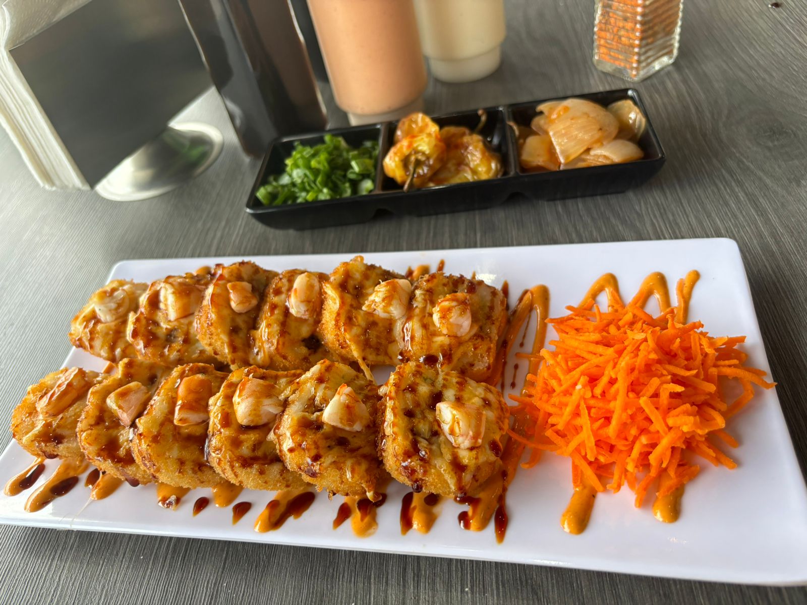Relleno de pollo, tocino, philadelphia y aguacate, gratinado con un topping de aderezo chipotle, camaron y salsa de anguila.