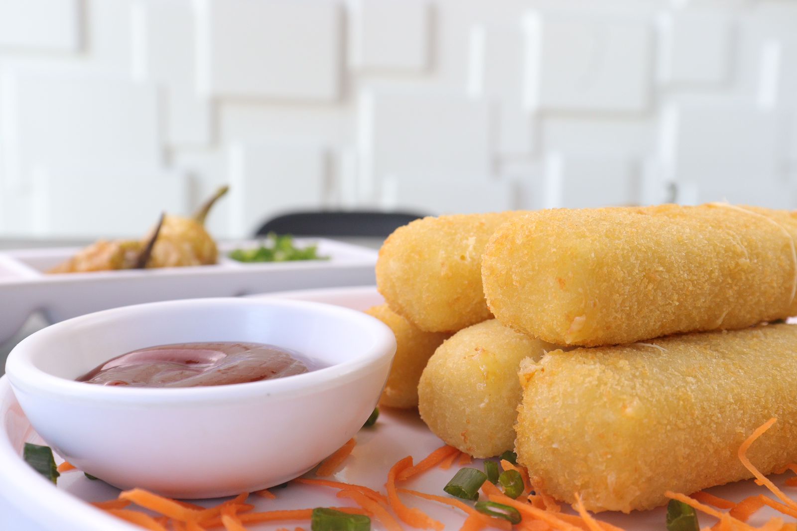 Dedos de queso empanizados, sobre una cama de zanahoria, acompañados con aderezo Ranch o Catsup. 5 piezas.