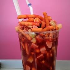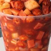 tostitos,churro de maiz,cacahuate,salchicha,pepino,clamato,limon y salsas locas