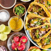 tacos dobles con frijol puerco barbacoa de res lechuga cebolla curtida y salsas
