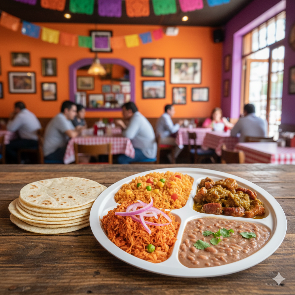 Guiso a elegir + Guarnición a elegir, acompañado de porción de tortillas de maíz.