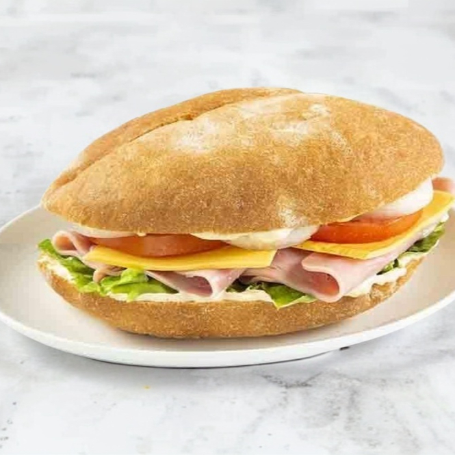 Torta de jamón con queso americano, lechuga, tomate, cebolla morada, aguacate y papas fritas.