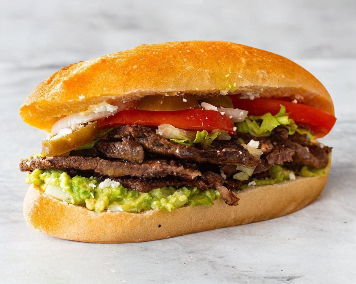 torta de carne asada, lechuga, queso chihuahua, tomate, jalapeños, cebolla, aguacate y papas fritas