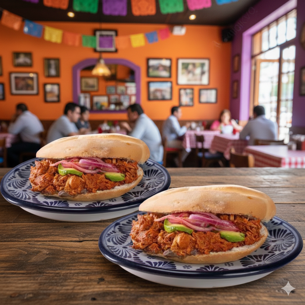 Torta de cochinita pibil, con lechuga, tomate, cebolla, aguacate, jalapeño, bañado en un rico caldo picosito y papas fritas.
