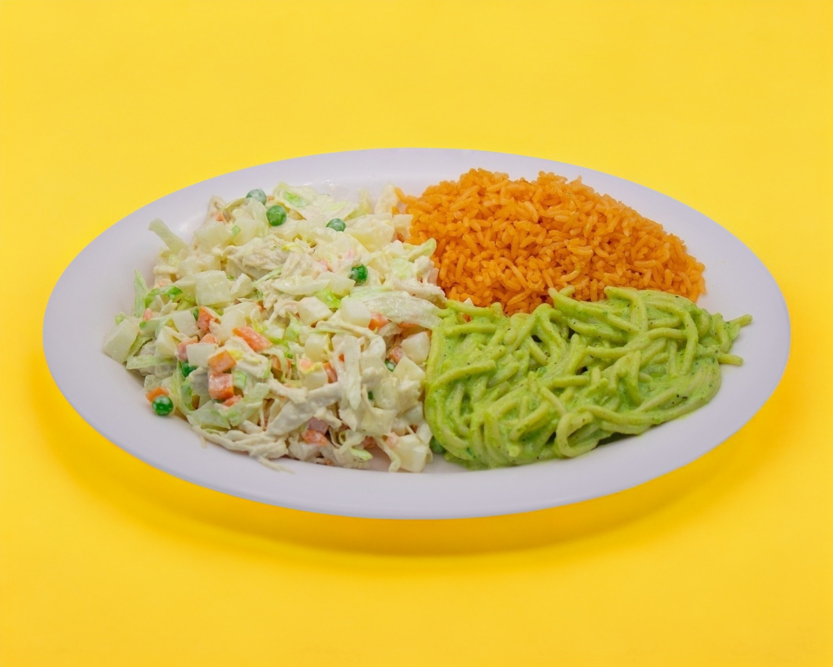 Ensalada con pollo, lechuga, zanahoria, chicharo, papa, mayonesa y 2 guarniciones a elegir
