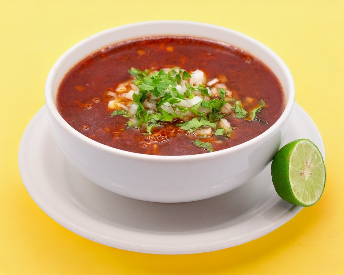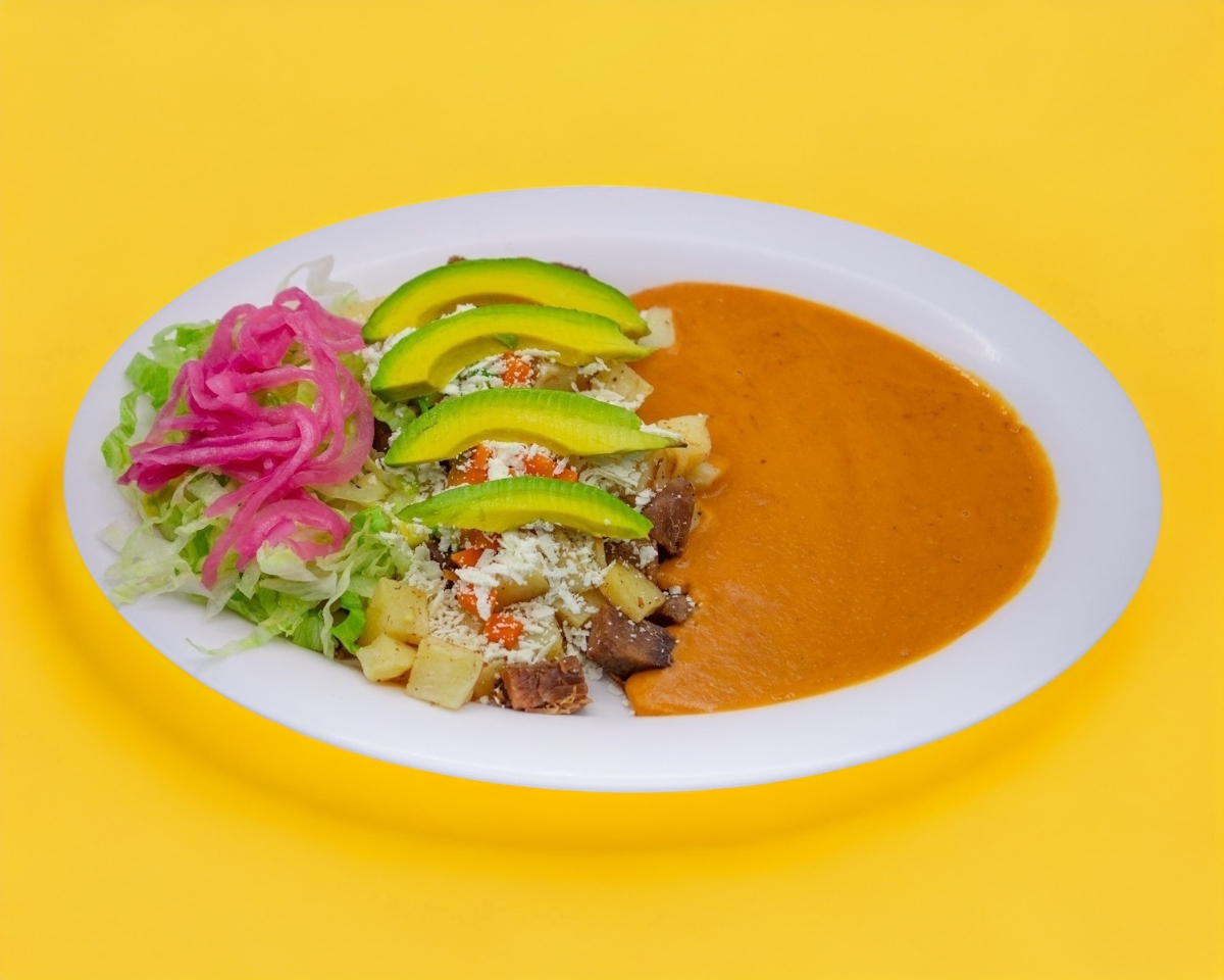 Cubos de carne de res y papa, lechuga, zanahoria, calabaza, cebolla curtida, aguacate, limón, queso, crema, acompañado de consomé