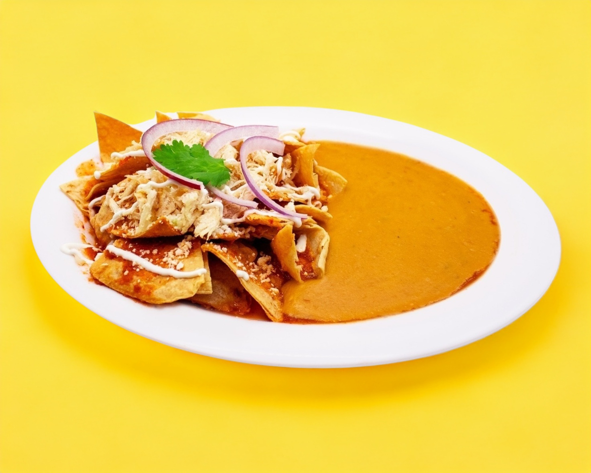 Chilaquiles de la casa bañados en salsa, con pollo, queso, crema, cebolla y cilantro